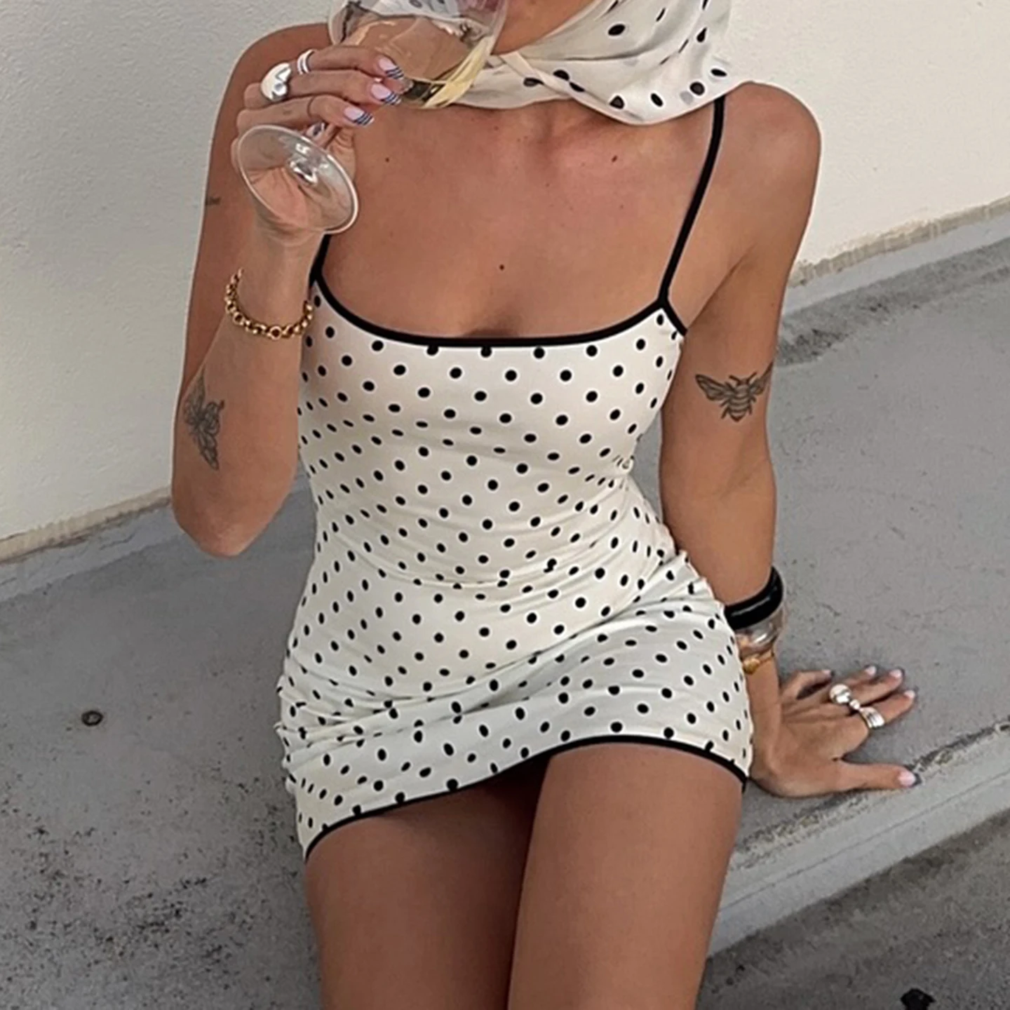 Women Polka Dot Spaghetti Strap Dress Slim Fit Sleeveless Bodycon Mini Dress for Summer Casual and Party Wear