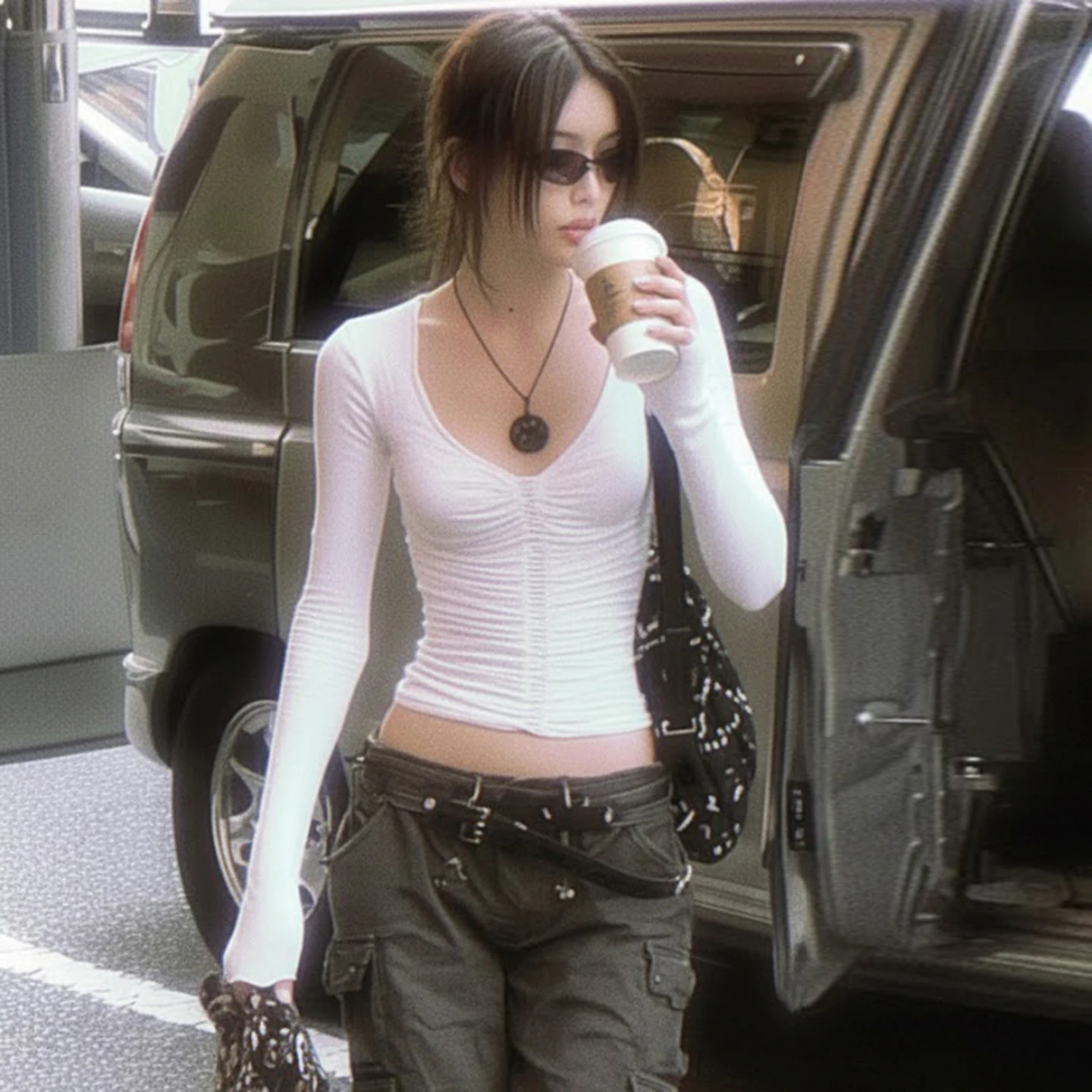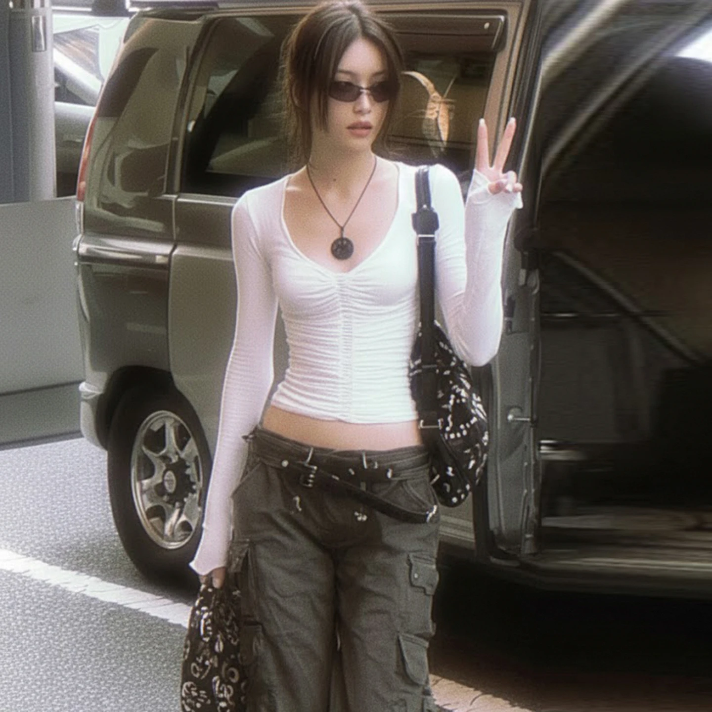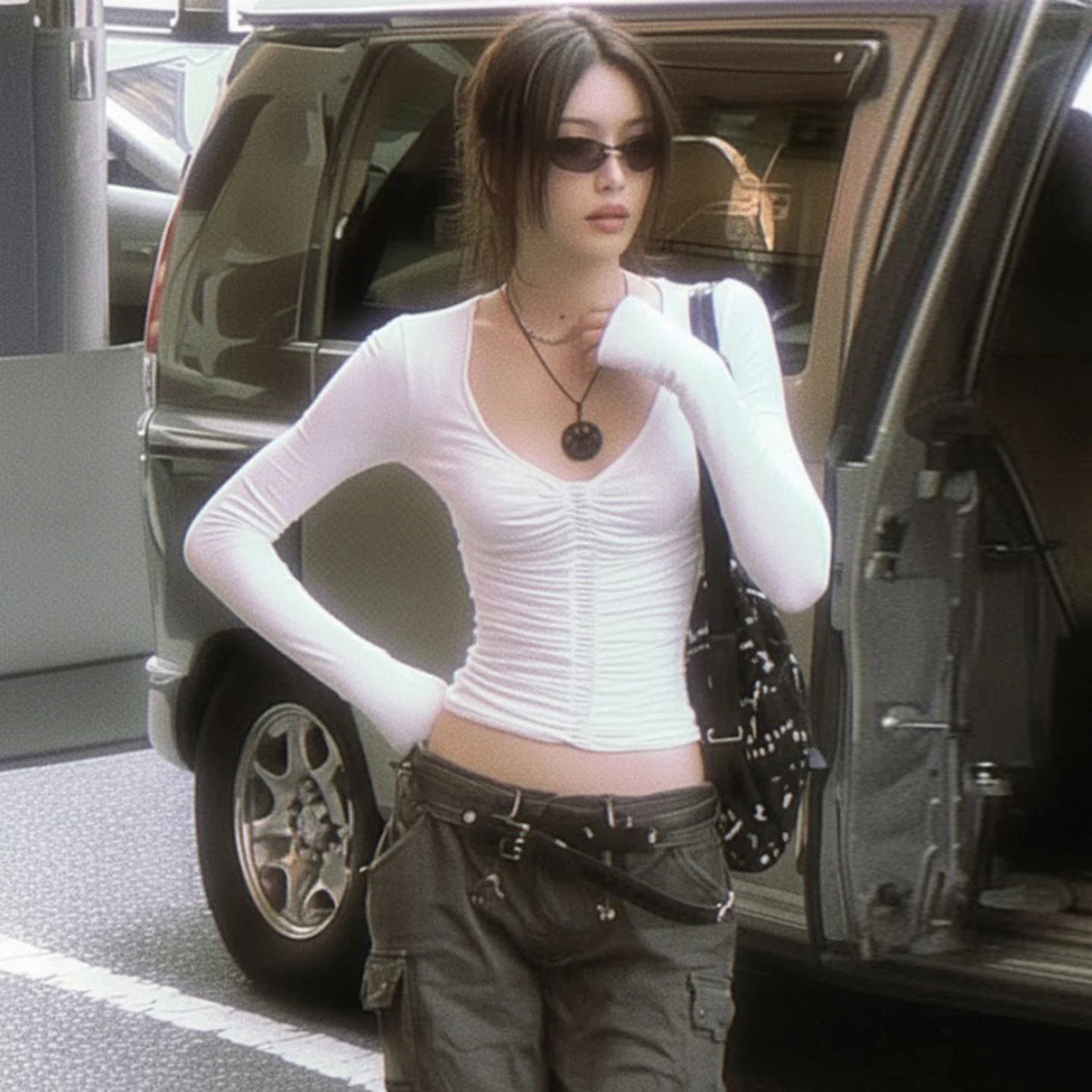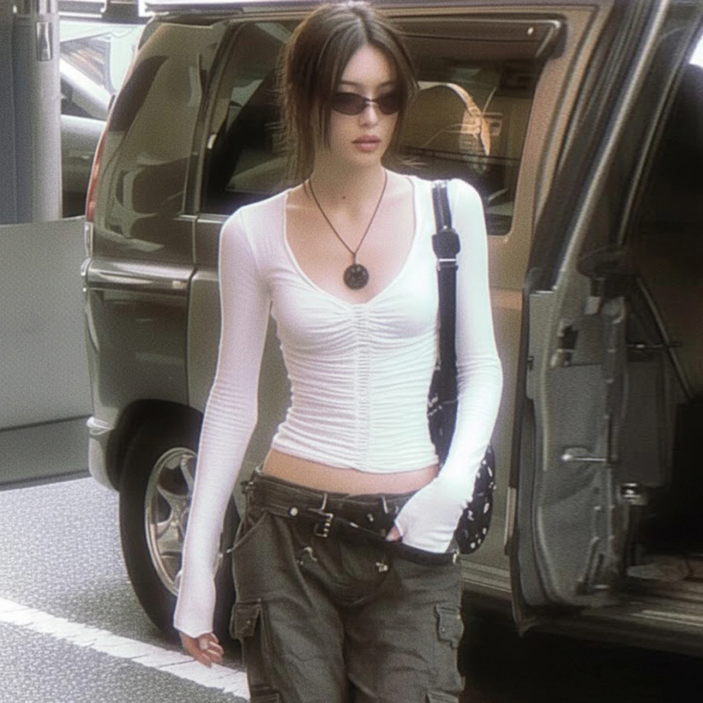 Women's White V-Neck Long Sleeve Crop Top Ruched Front Design Stretchy Slim Fit Breathable High Street Basic Tee Daily Wear
