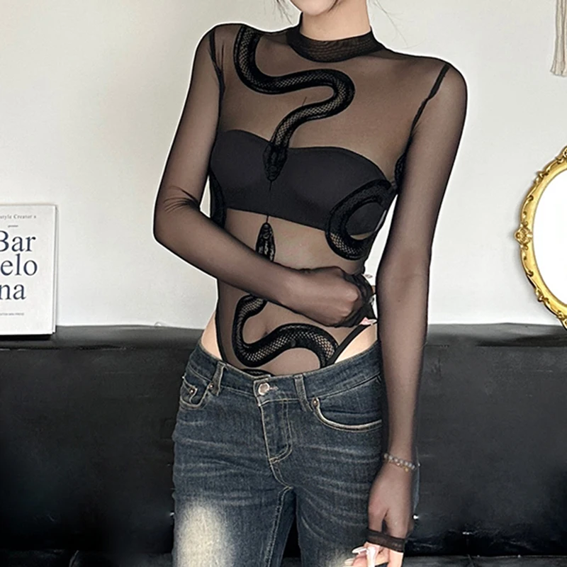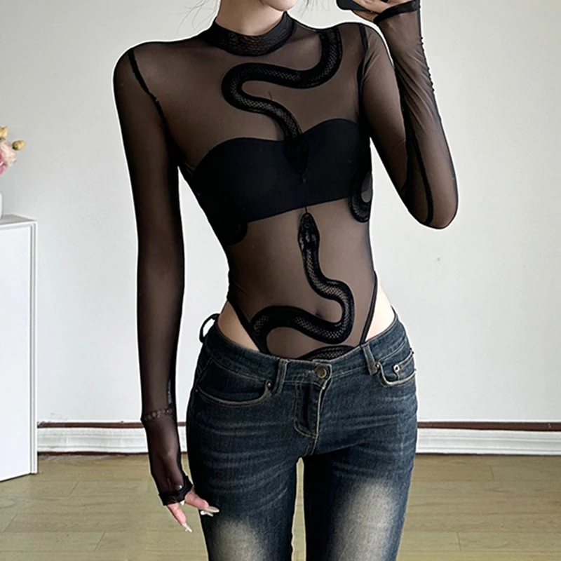 Black Sheer Mesh Flocking Snake Print Bodysuit Sexy Long Sleeves Jumpsuit for Women Customizable Wholesale 2026