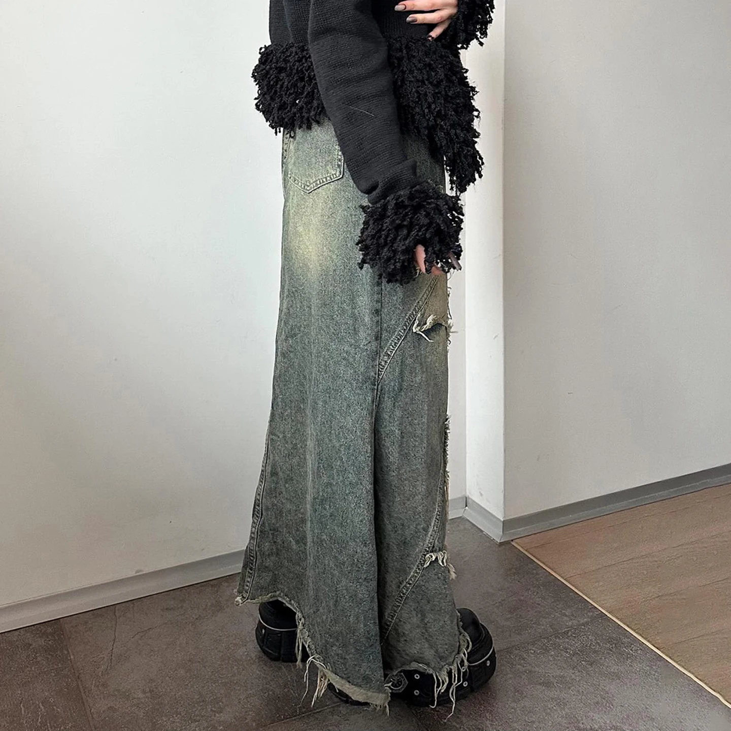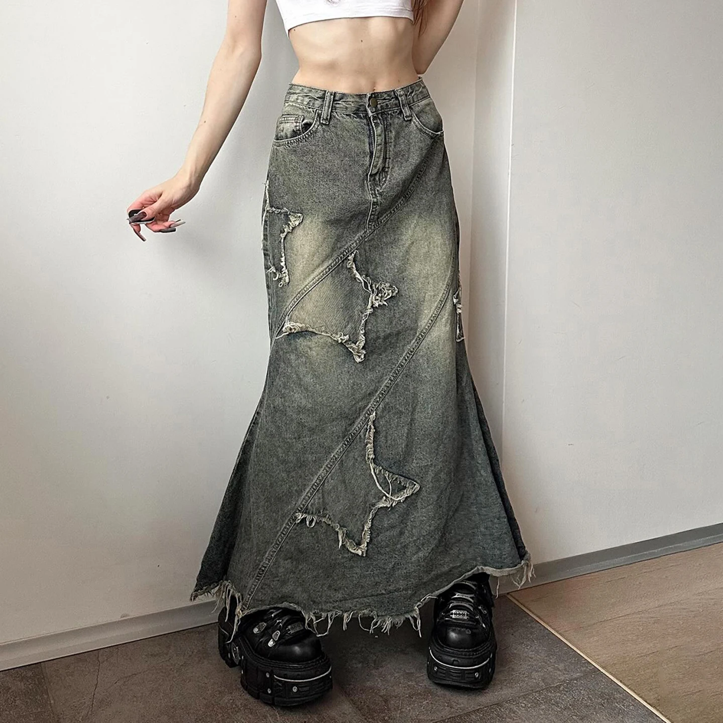 Women's High Waist Denim Maxi Skirt with Distressed Star Patchwork and Tassel edges Vintage A-Line Long Jean Skirt