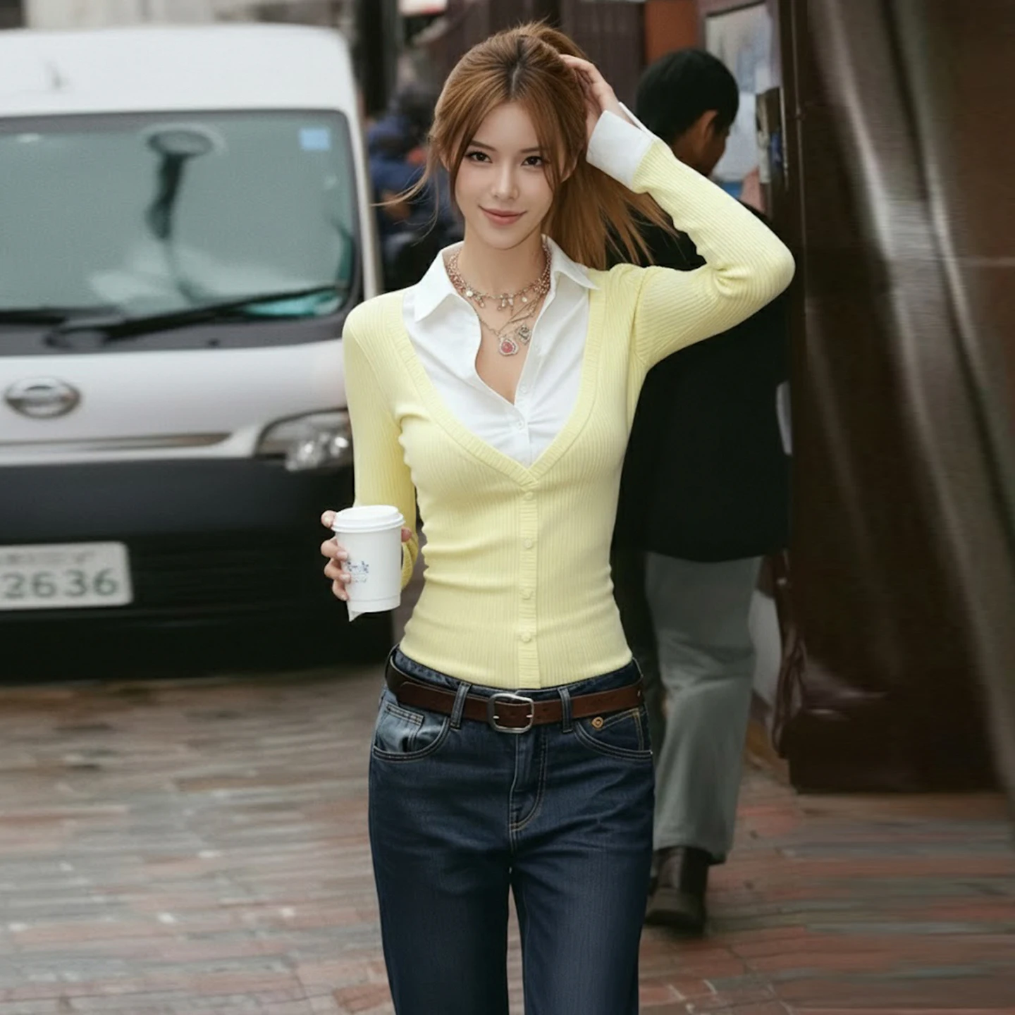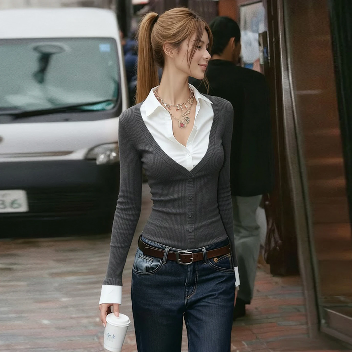Women's Lapel Knit Top with Patchwork White Shirt Collar and Cuff Front Button Design Office Casual Wear Wholesale Supplier