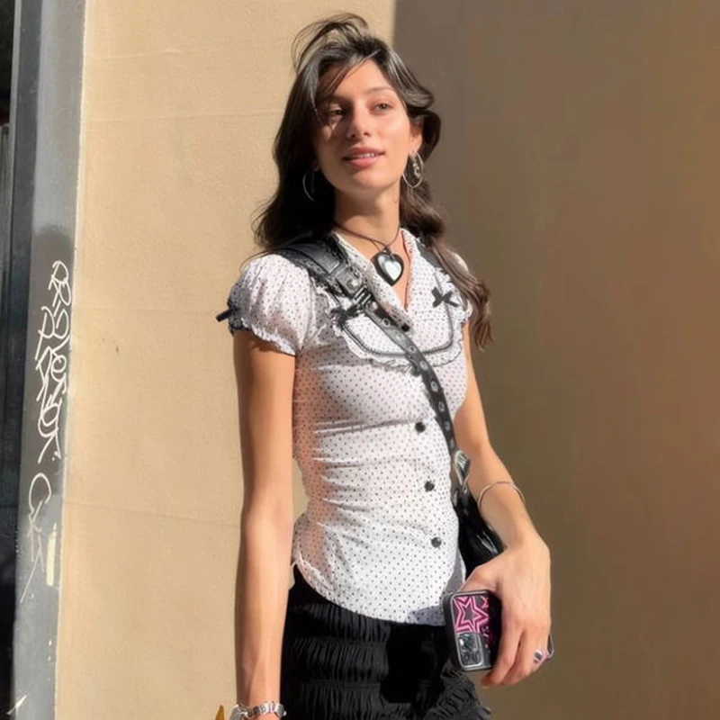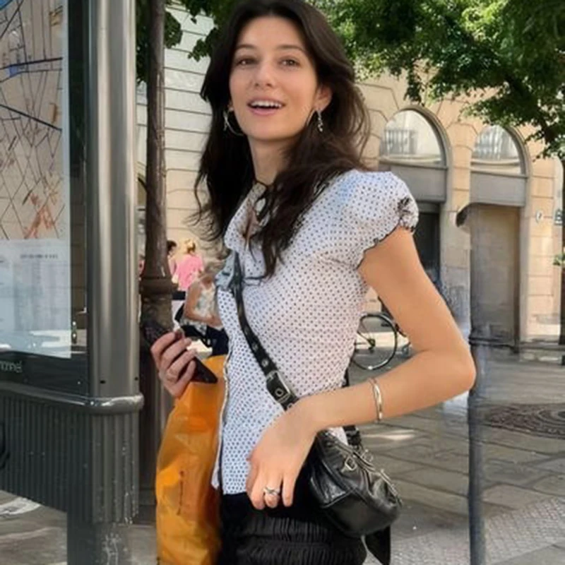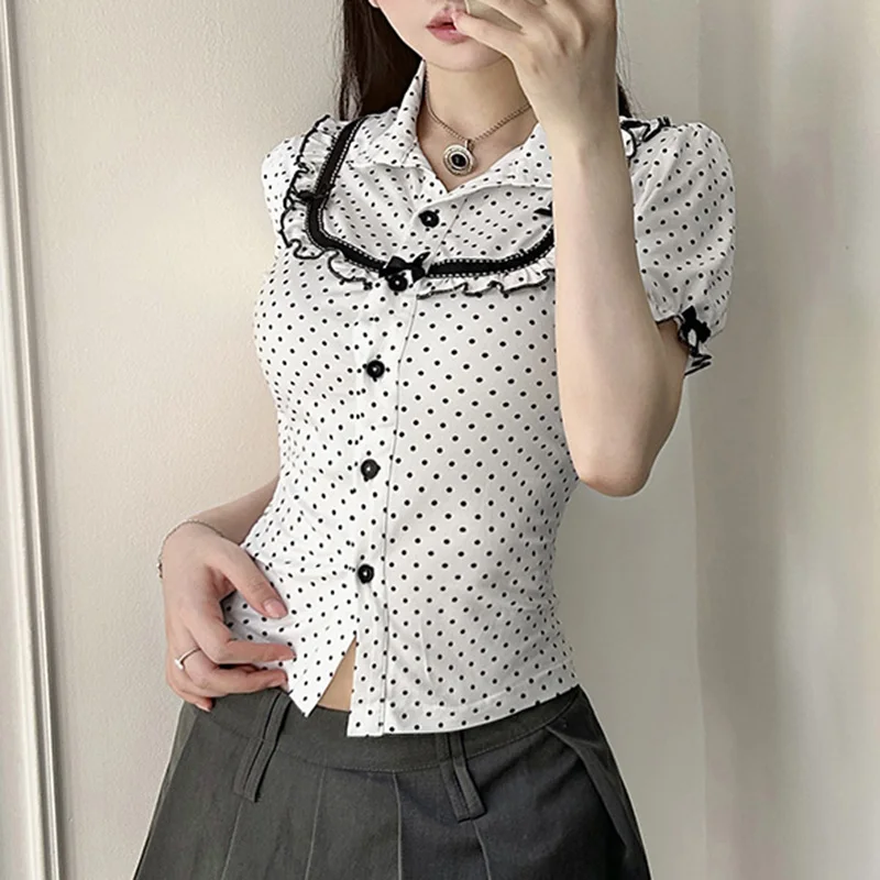 Polka Dot Ruffled Collar Puff Sleeve Button Front Shirt Women Sweet Casual Fashion Versatile Long Sleeve Top