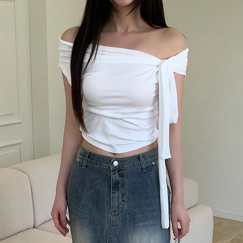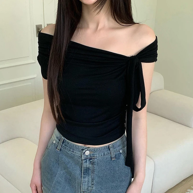 Off Shoulder Strappy Knot Detail Cropped T Shirt Women Solid Color Slim Fit Casual Street Fashion Top