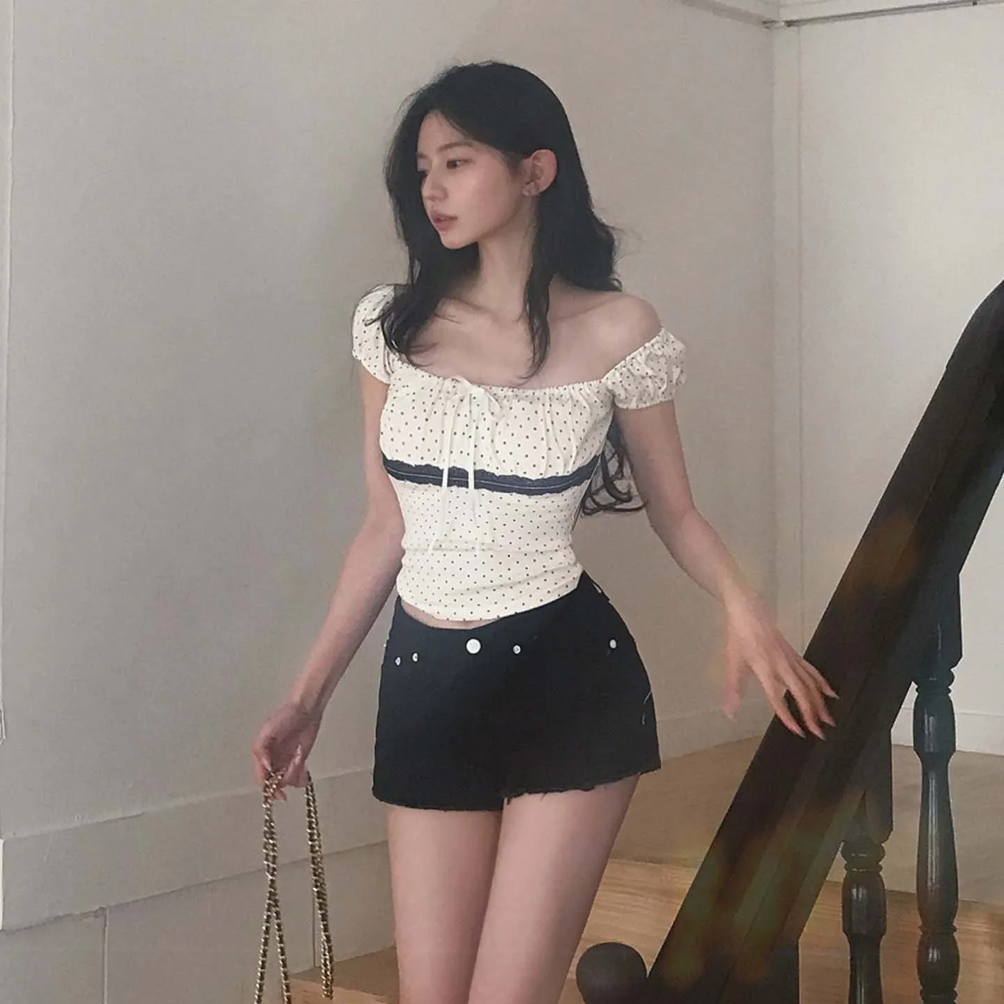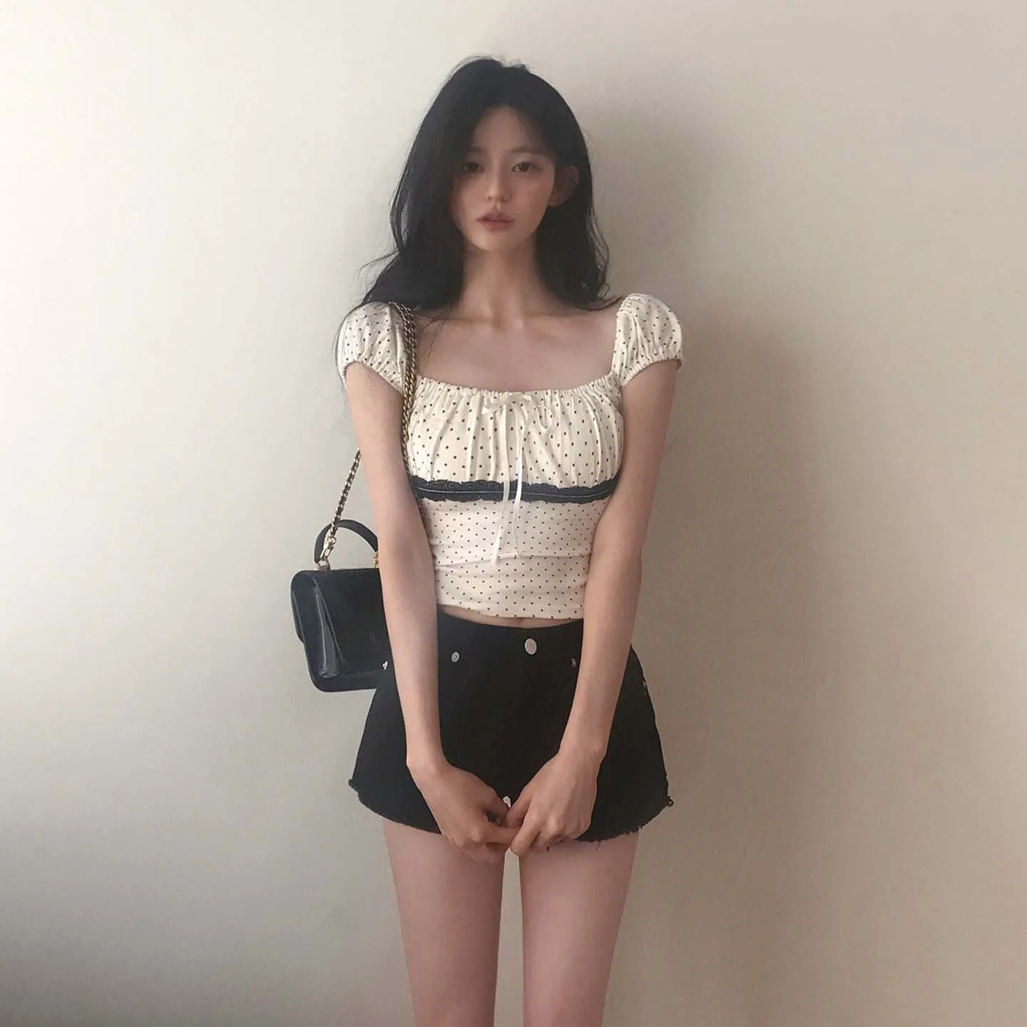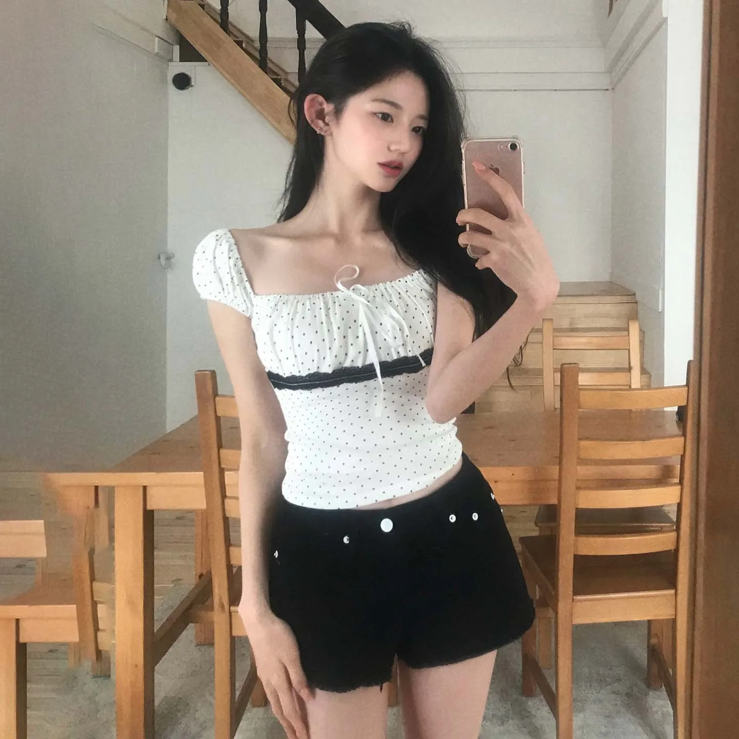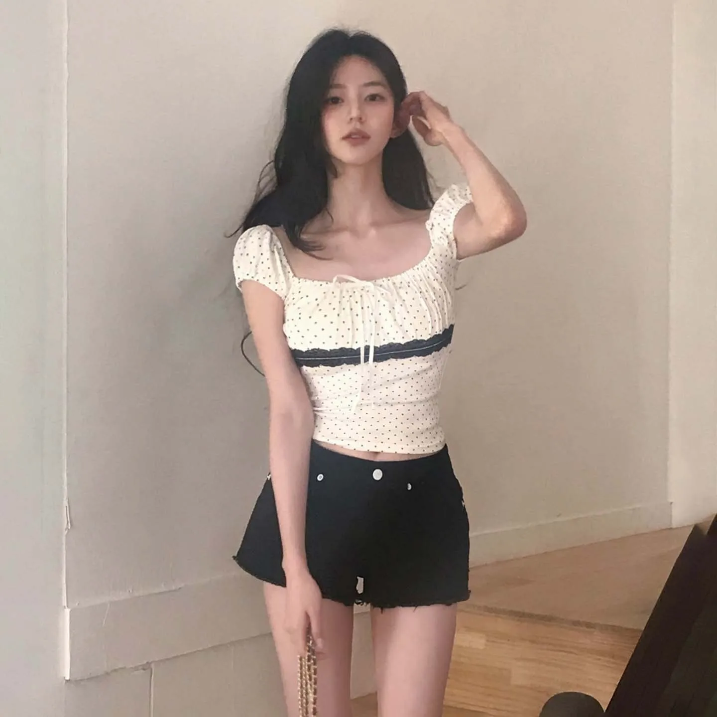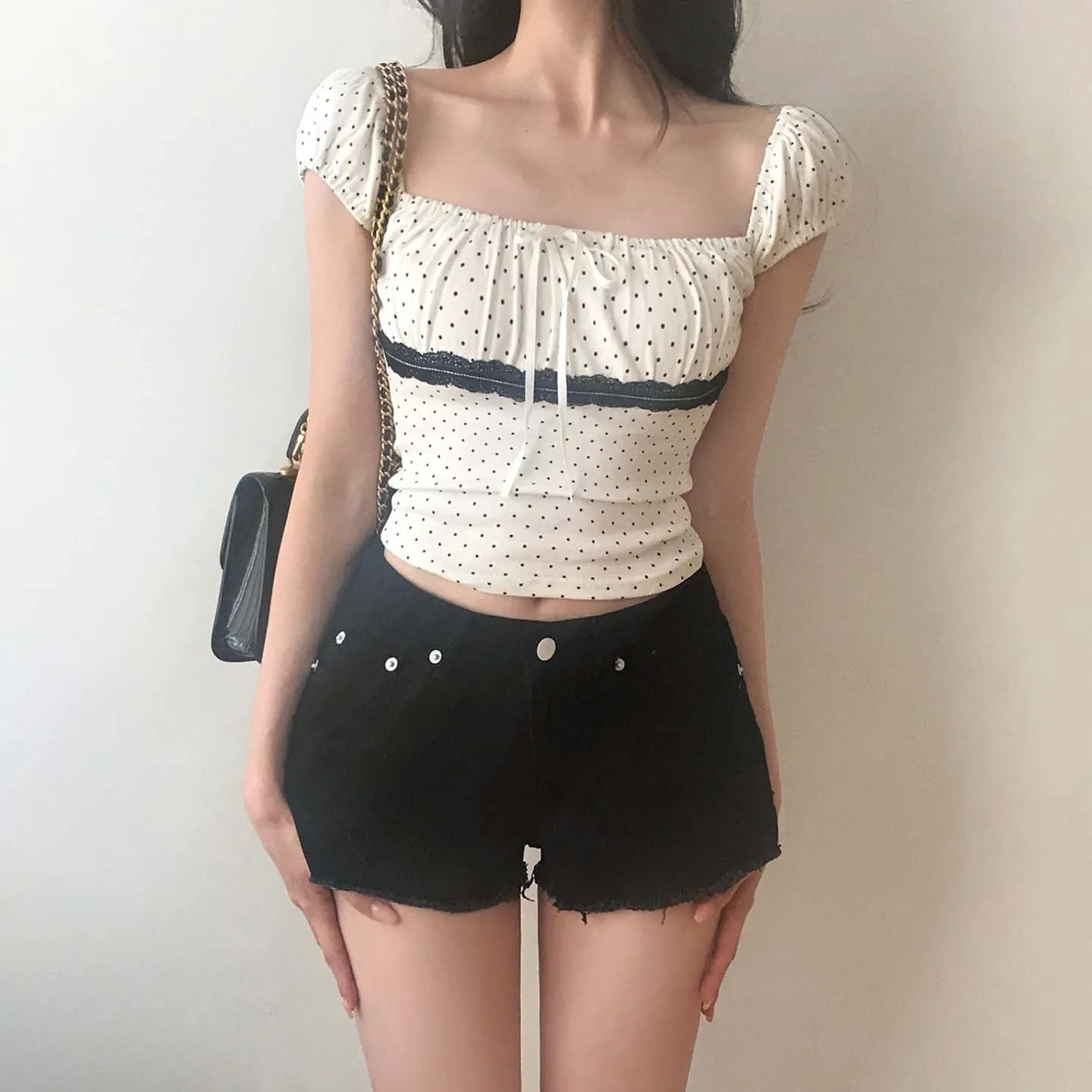 Polka Dot Square Neck Short Sleeve Knit T-Shirt Top with Color Block Lace Trim Sweet Casual Fashion Style
