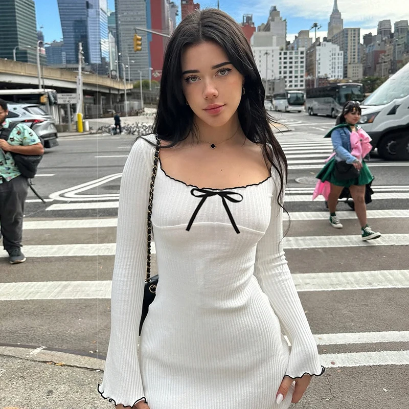 ribbon bow ruffle color blocking crew neck long sleeves short skirt simple elegant sexy dress