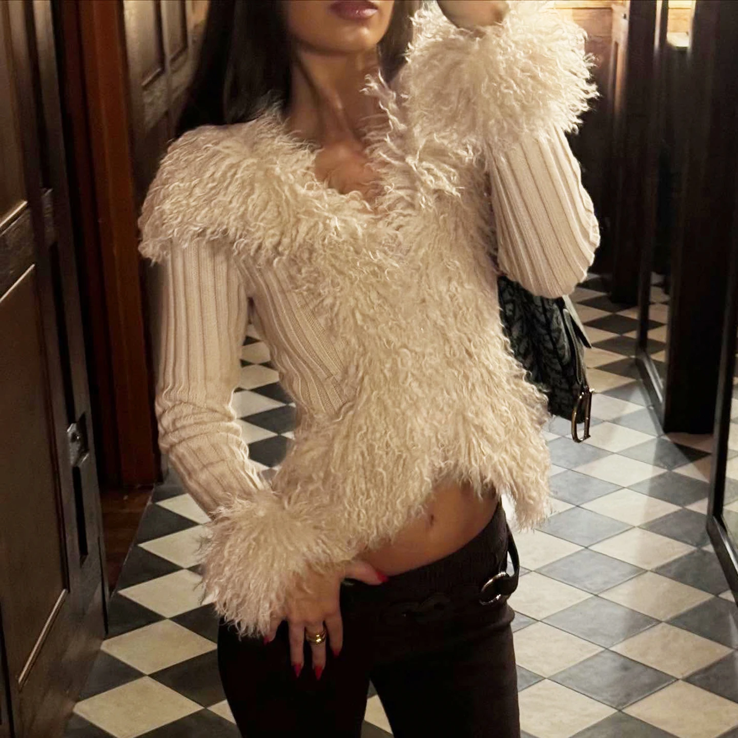 Teddy fur V-neck zipper asymmetrical slim fit coat Plain and simple knitting winter tops