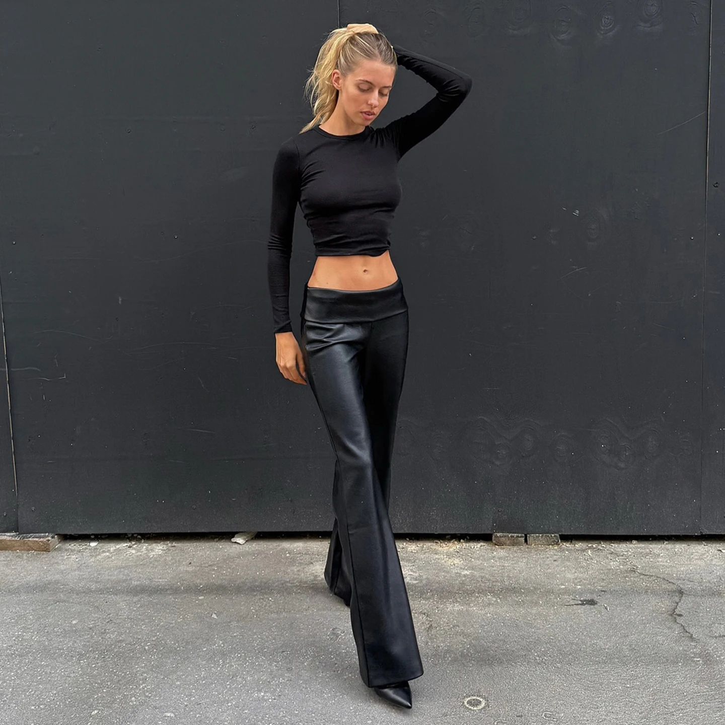 Simple Pleated Low-Rise PU Leather Flared Pants Women Solid Color Street Casual Fashion Versatile Trousers
