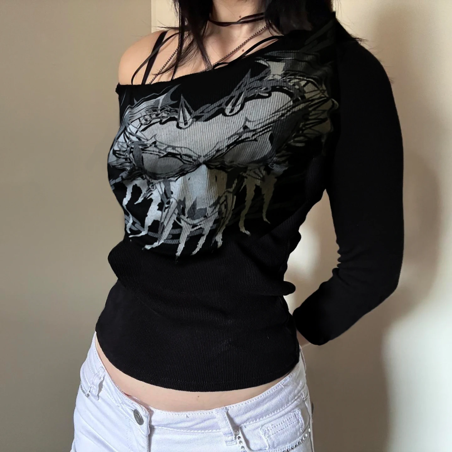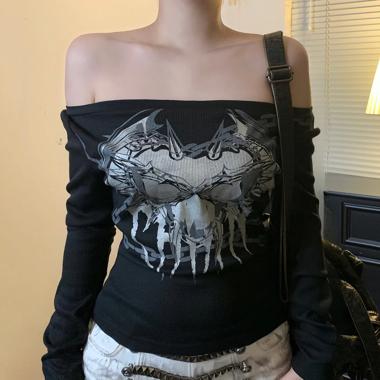 Retro Print Off-Shoulder Long-Sleeve T-Shirt Top for Women Y2K Street Casual Fashion Versatile Pullover Style