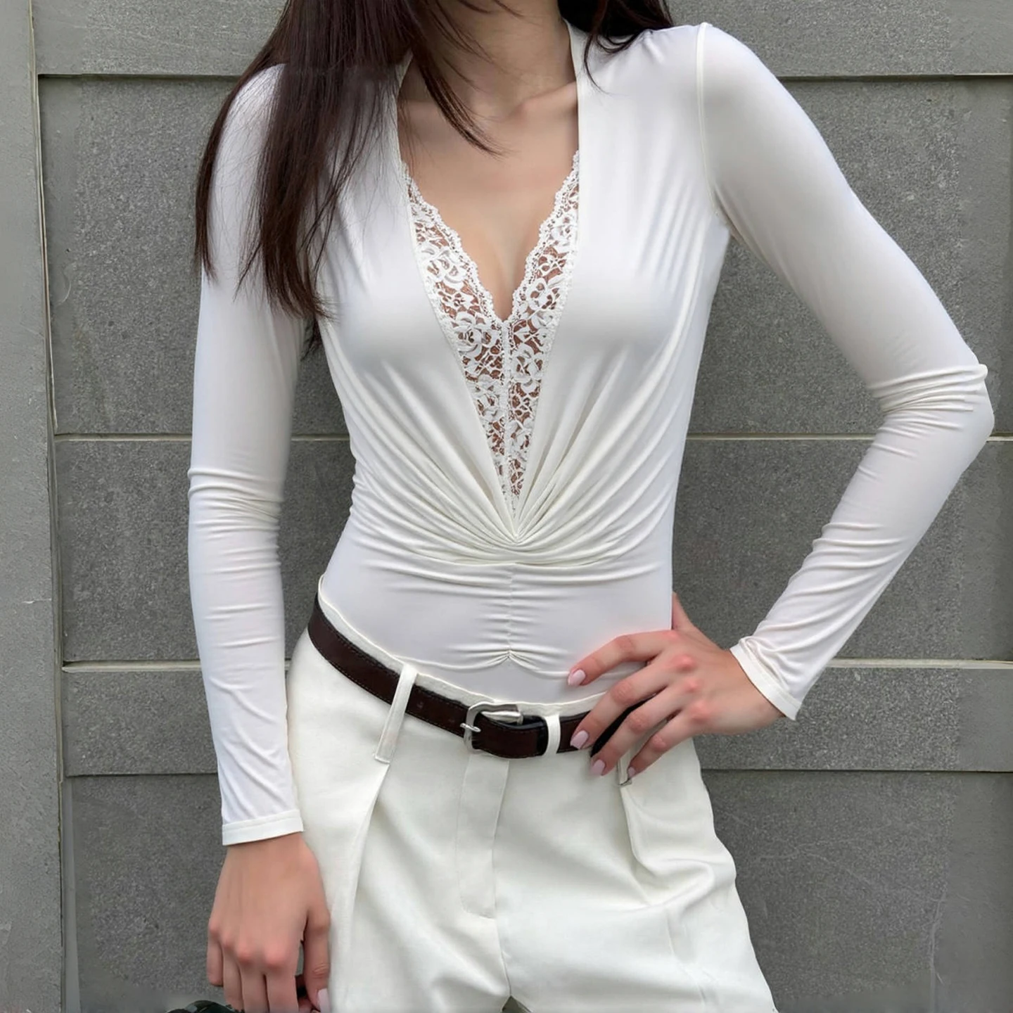 Lace Trim Deep V-Neck Pleated Long Sleeve Bodysuit Women Chic Casual Fashion One-Piece Top Comfortable Stretch Style