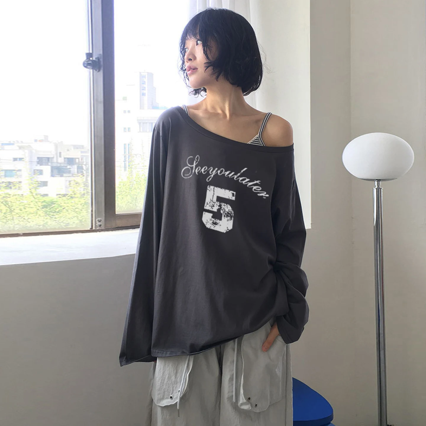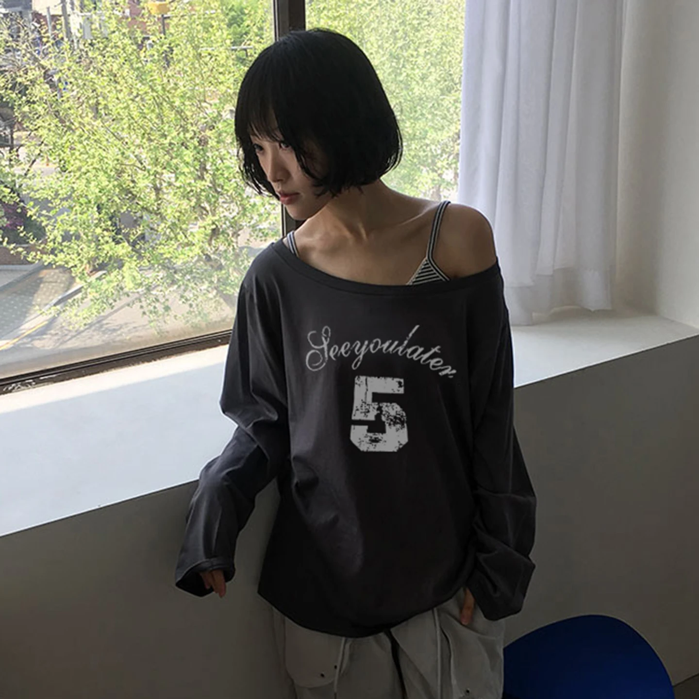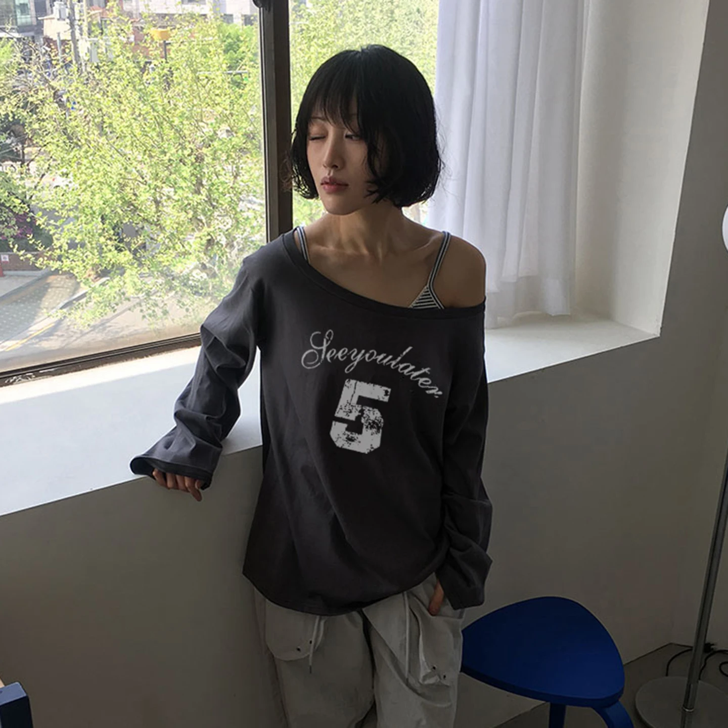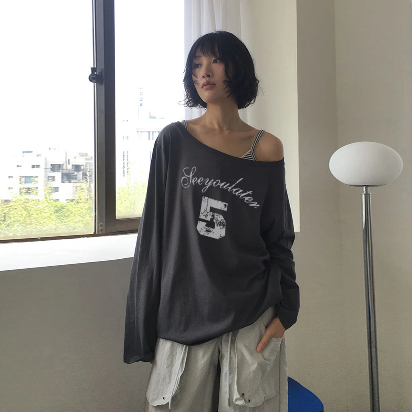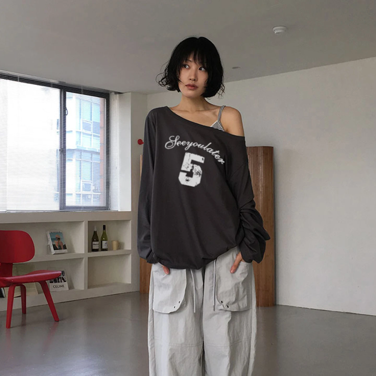 Pattern Print Off-Shoulder Loose Long Sleeve T-Shirt Women's Casual Street Style Versatile Top Y2K Trendy Design