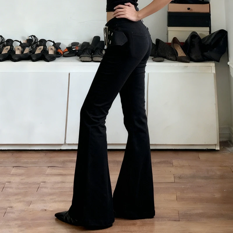 Eyelet Belt-Decorated Low-Rise Flared Denim Jeans Women Y2K Street Casual Loose-Fit Trendy Versatile Trousers