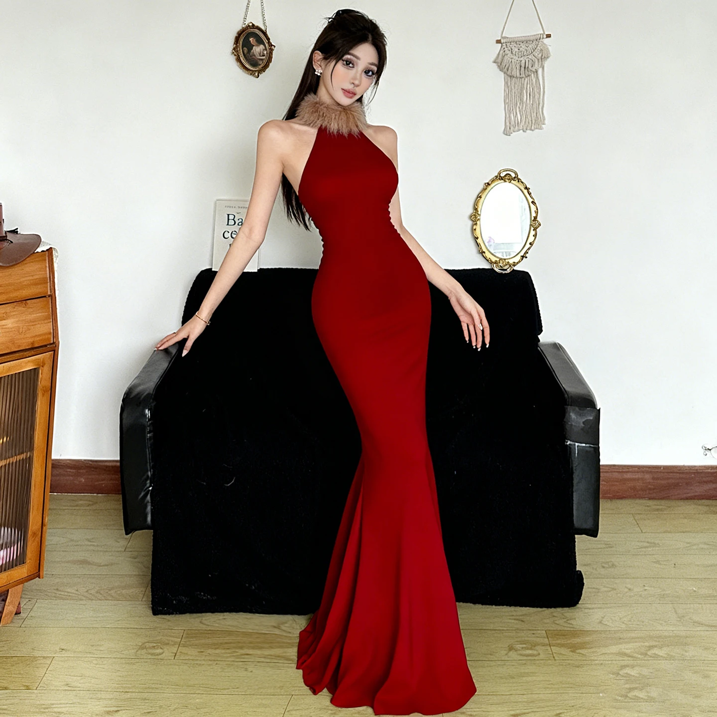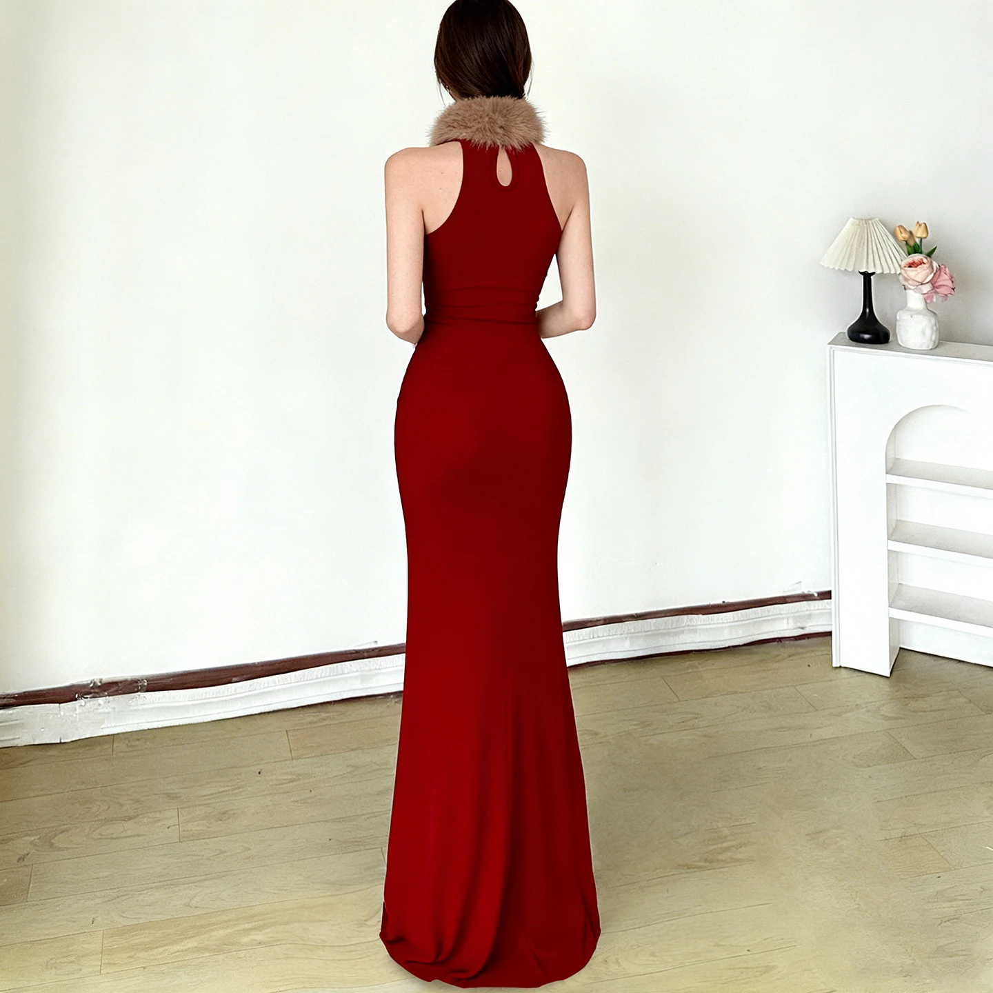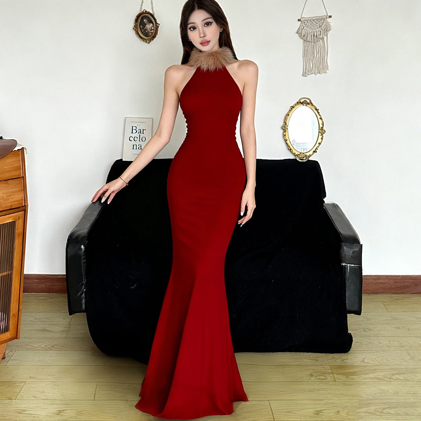 fluffy halter neck collar sleeveless Slim-fit floor-length fishtail skirt Christmas Red sexy and elegant party dress