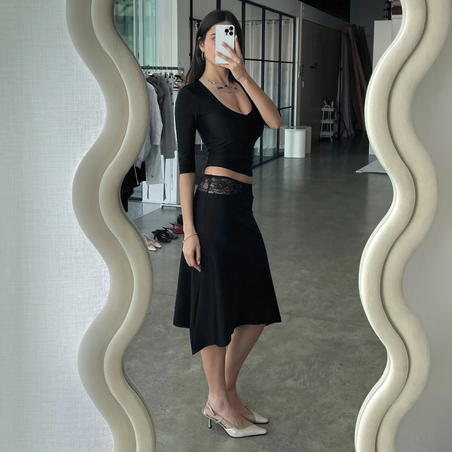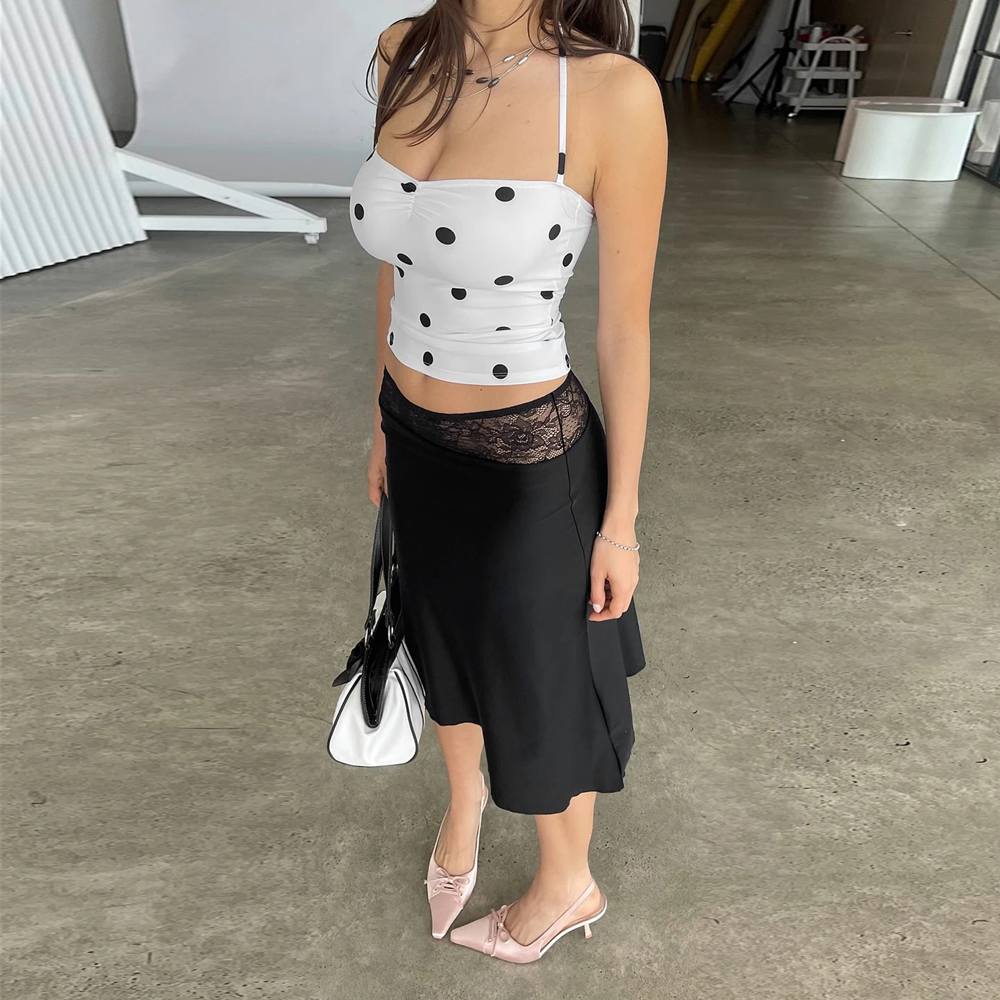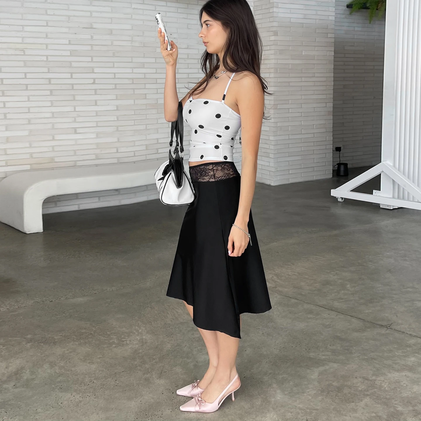 Waist lace patchwork Slim-fit A-line midi skirt Black satin Minimalism Elegant, casual, and sexy skirt