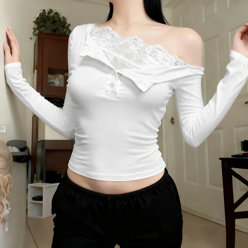 Women's Asymmetric Off-Shoulder Long Sleeve Crop Top with Lace Trim and Buttons Stylish Slim Fit T-Shirt for Daily Casual Wear