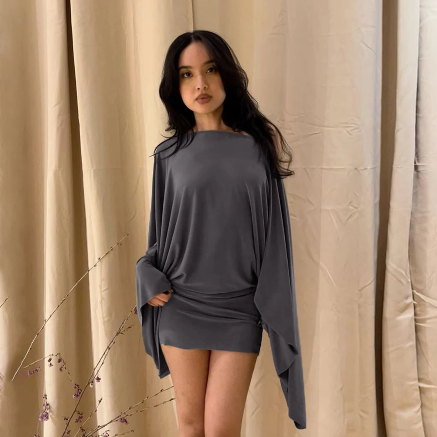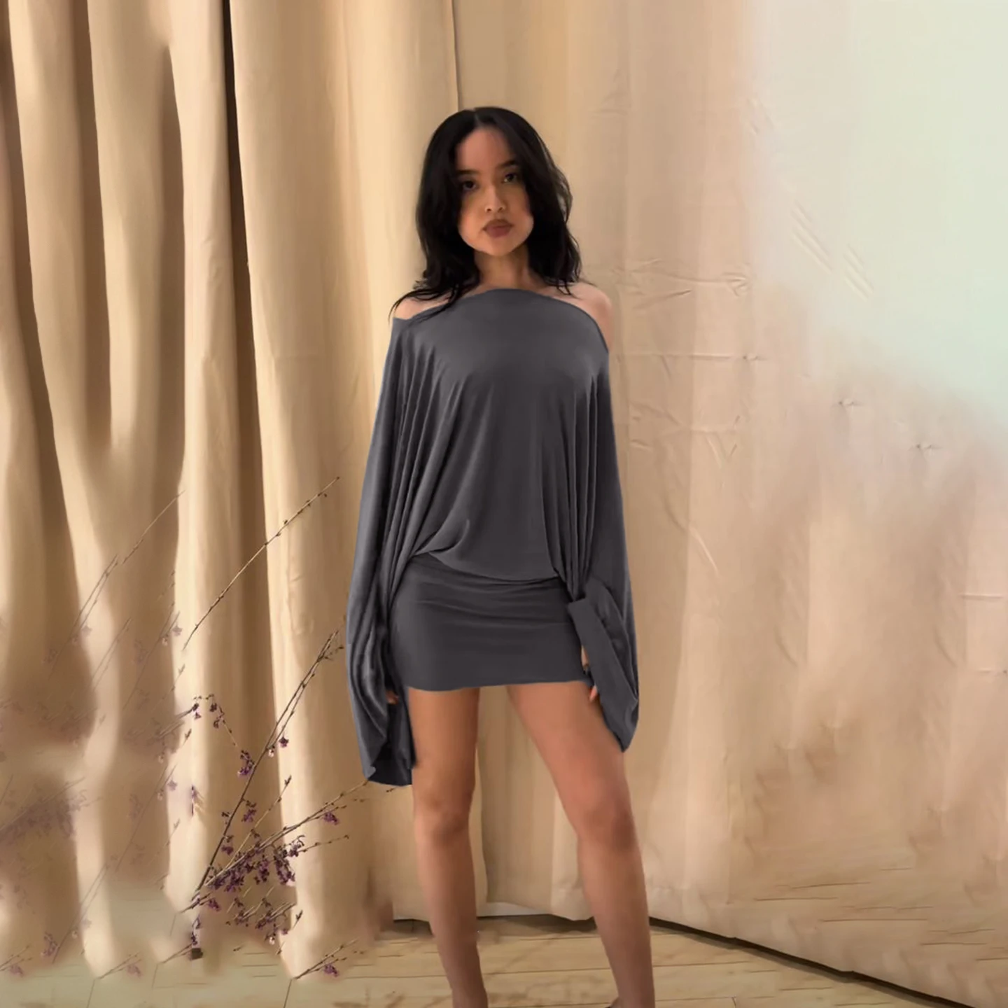 Off-the-shoulder loose long sleeves hip wrap drape feeling dress Simple, sexy, and unique autumn short skirt