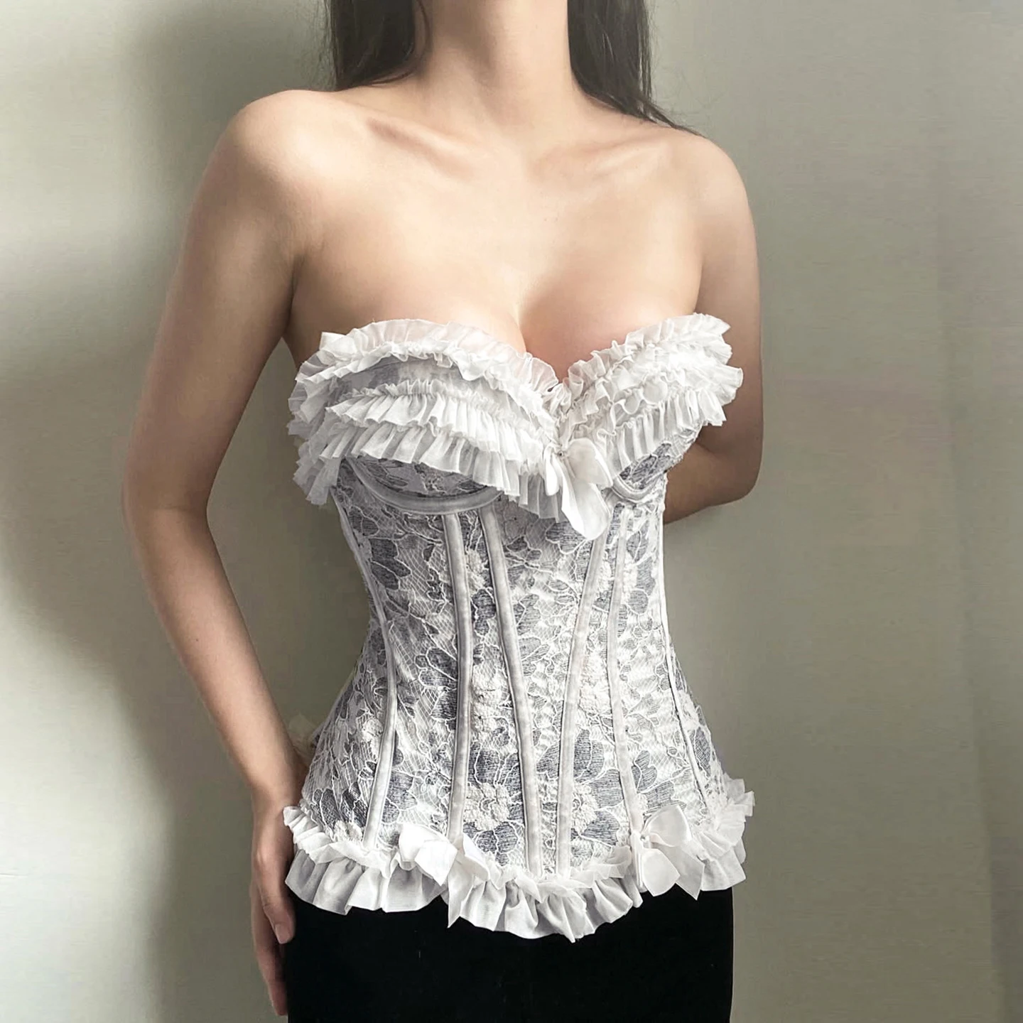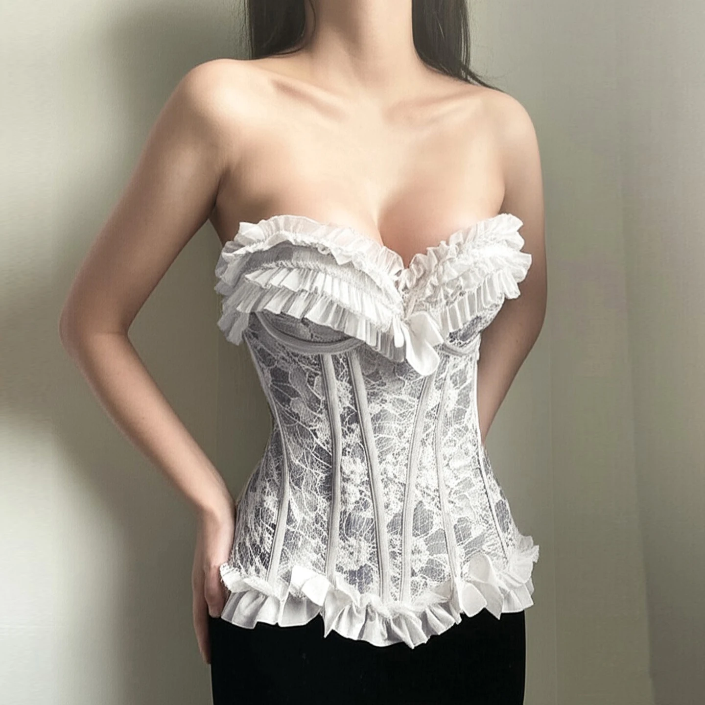 Strapless Ruffled Lace Bow Trim Vest Top for Women, Slim Fit Waist-Cinching Sweet Casual Fashion Versatile Style
