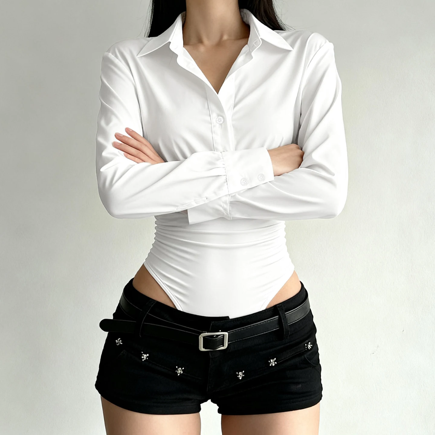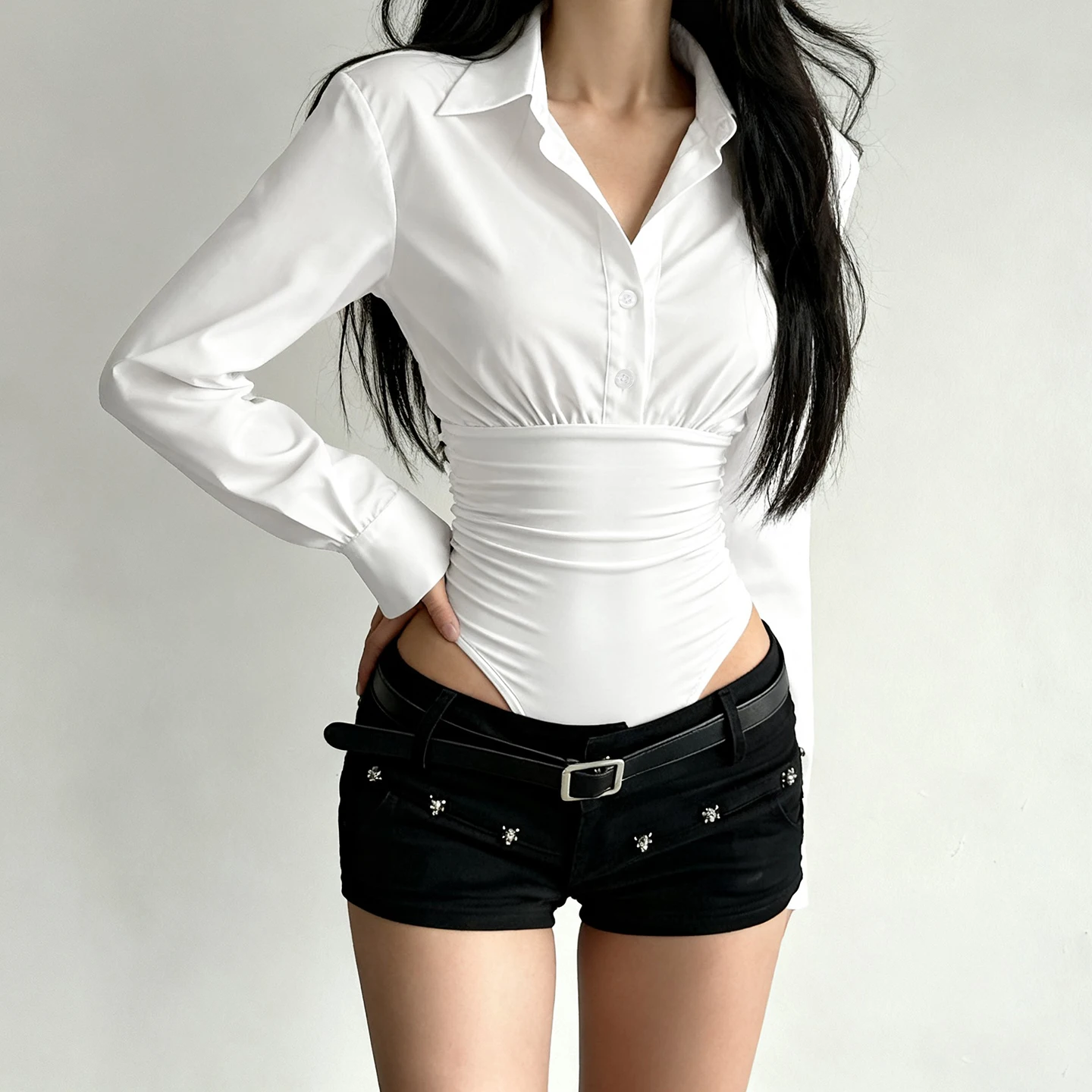 Lapel Single-breasted Long Sleeve Waist shaping top New autumn style solid color basic commuter street style shirt bodysuit