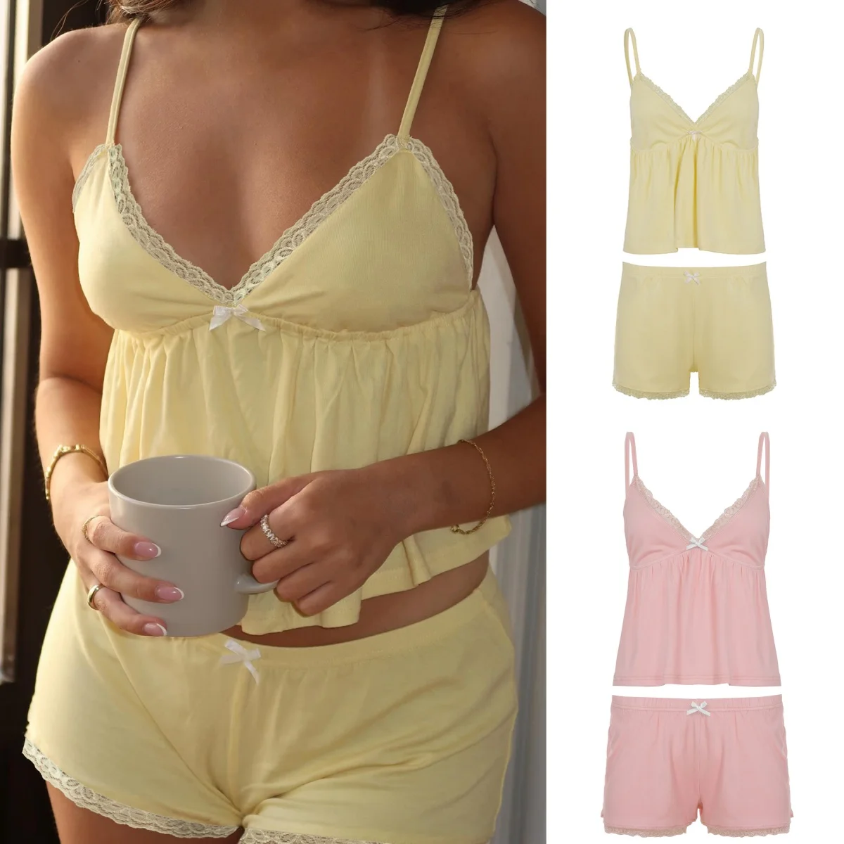 Lace-trimmed V-neck spaghetti straps A-line loose tank top high-waisted shorts Plain colors basical sexy outerwear pajama Set
