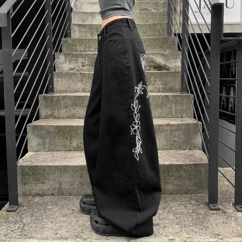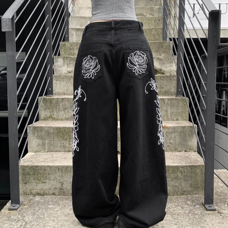 Loose Fit Low-Waist Wide-Leg Straight Jeans for Women with Back Floral Embroidery, Casual Street Style Denim Pants