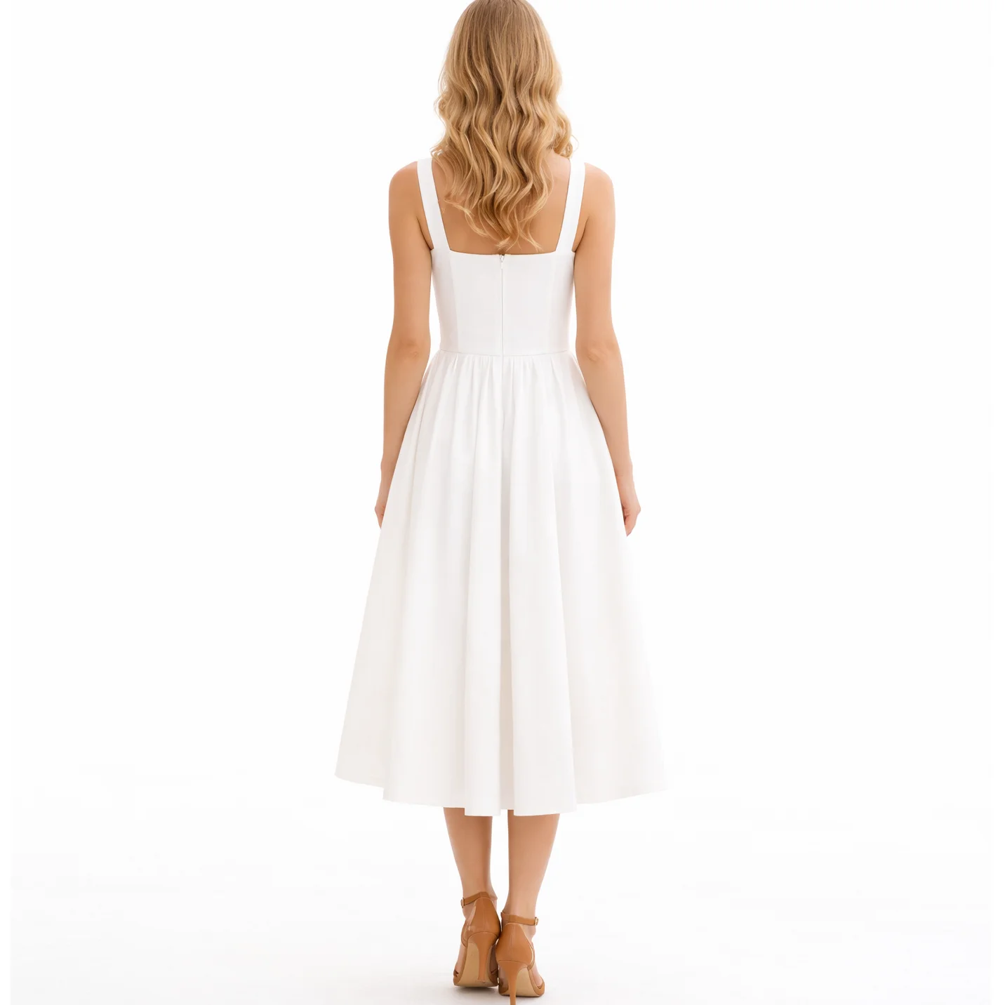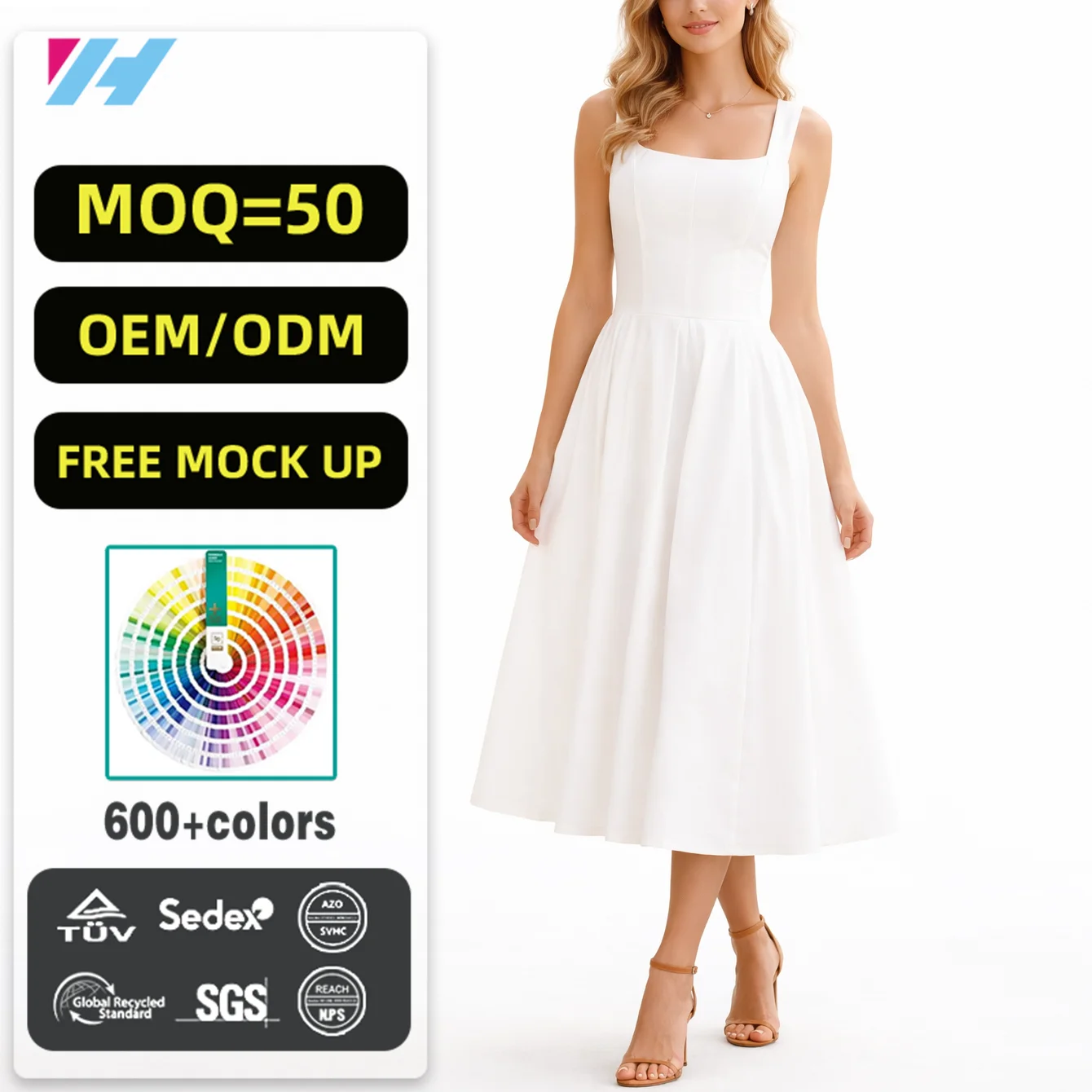 Custom Wholesale Oem Manufacturer square Neck A-line Ladies Women White Pleated Long Dress