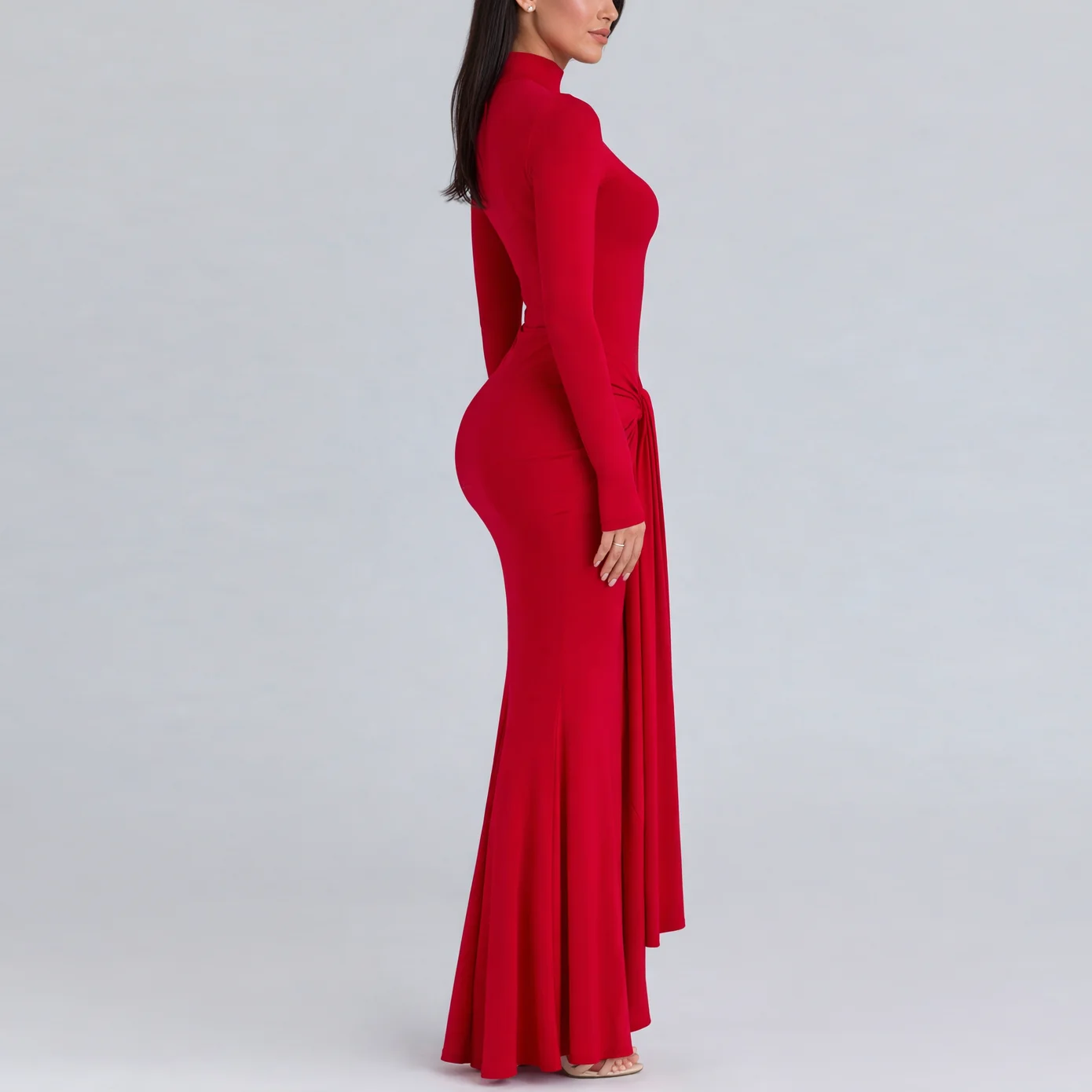 Custom High Quality Summer Casual Long Sleeve Solid Woven Party Red Flounce Hem Maxi Dress
