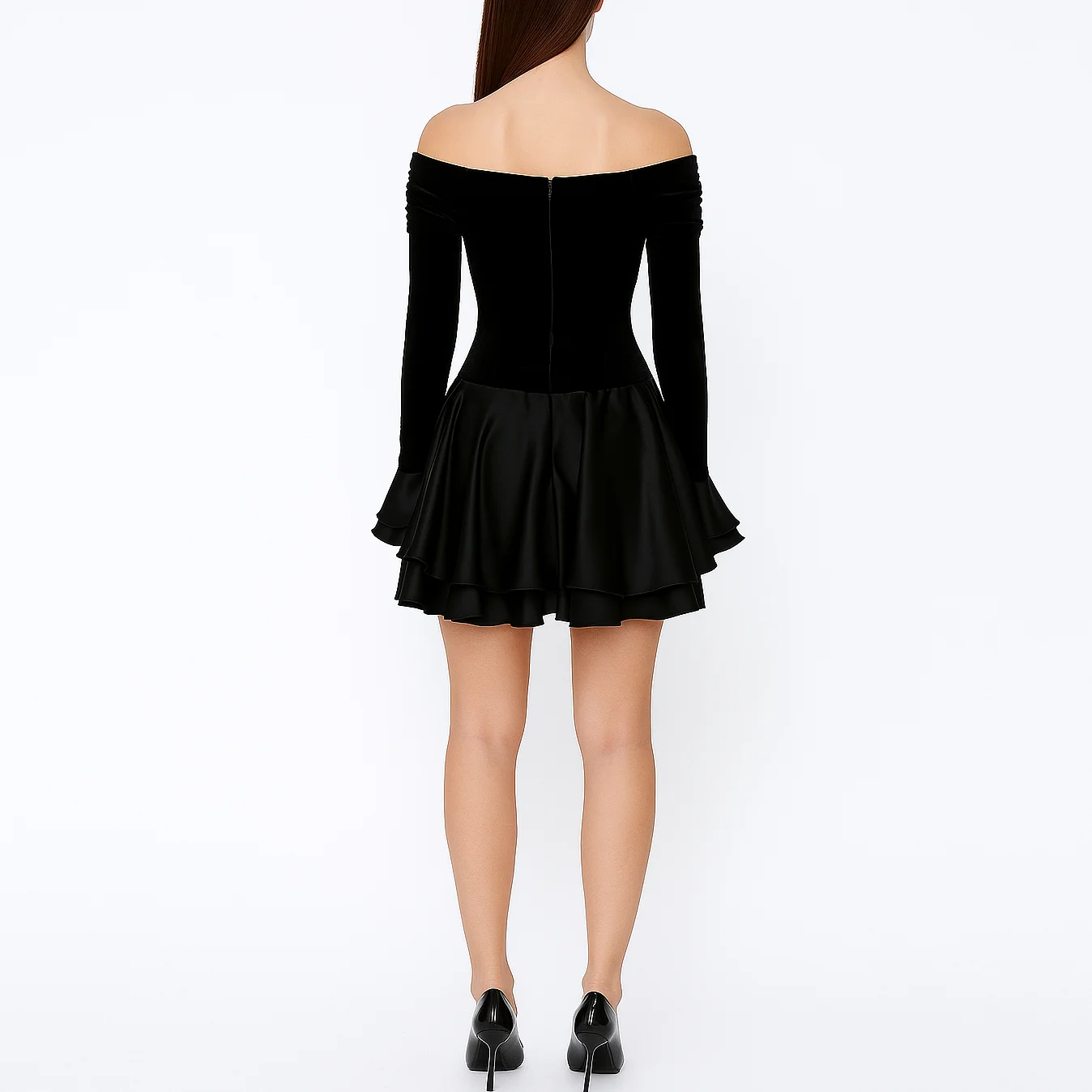 ZYHT 21938 Black Velvet Mini Dress Square Neck Long Puff Sleeves with Pearl Trim & Crystal Dess Flared Scalloped Hem Dresses