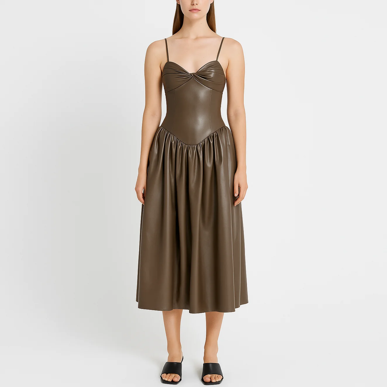 Custom Wholesale Fashion Elegant Evening Party Midi Long Ladies Women Ruched Pleated Pu Leather Dress