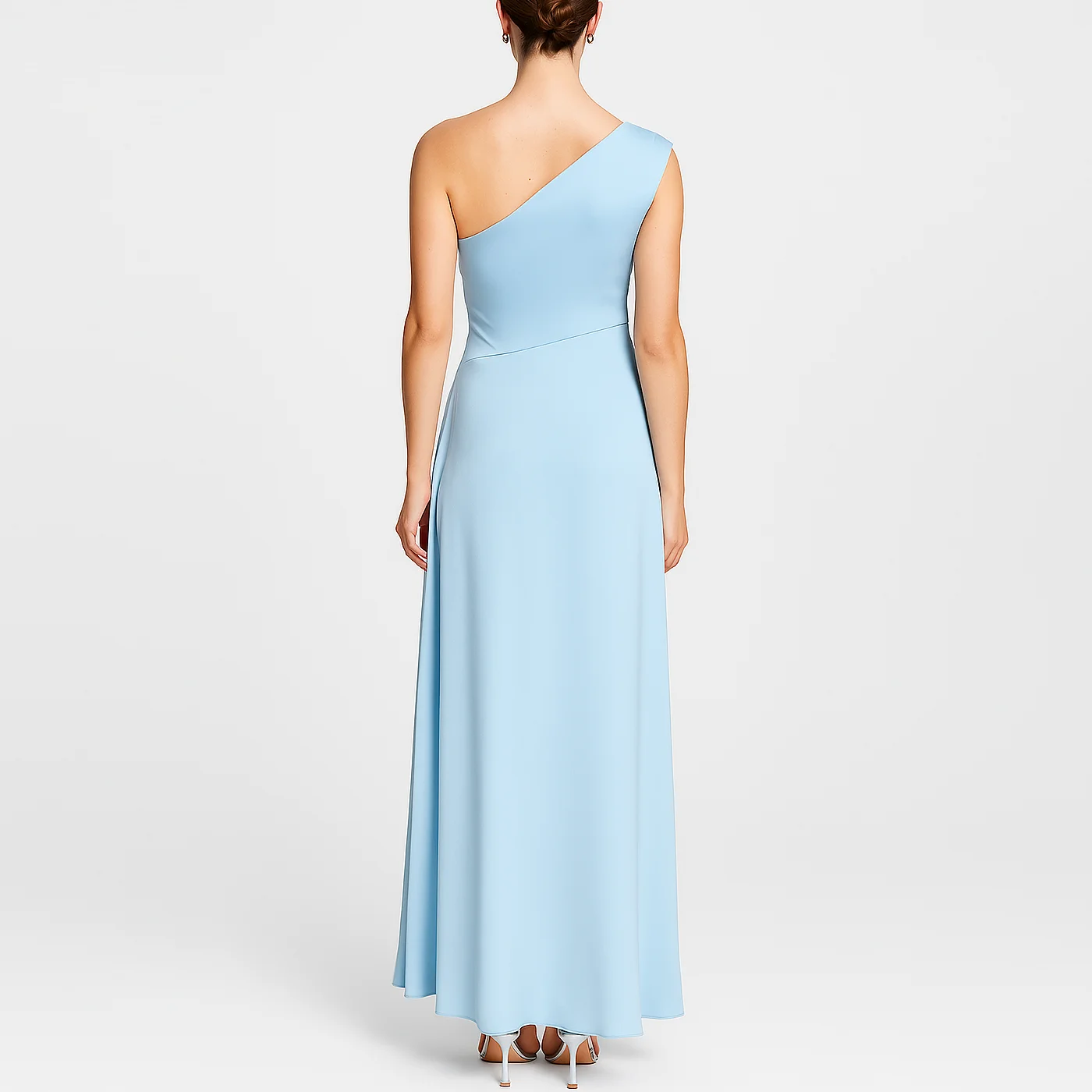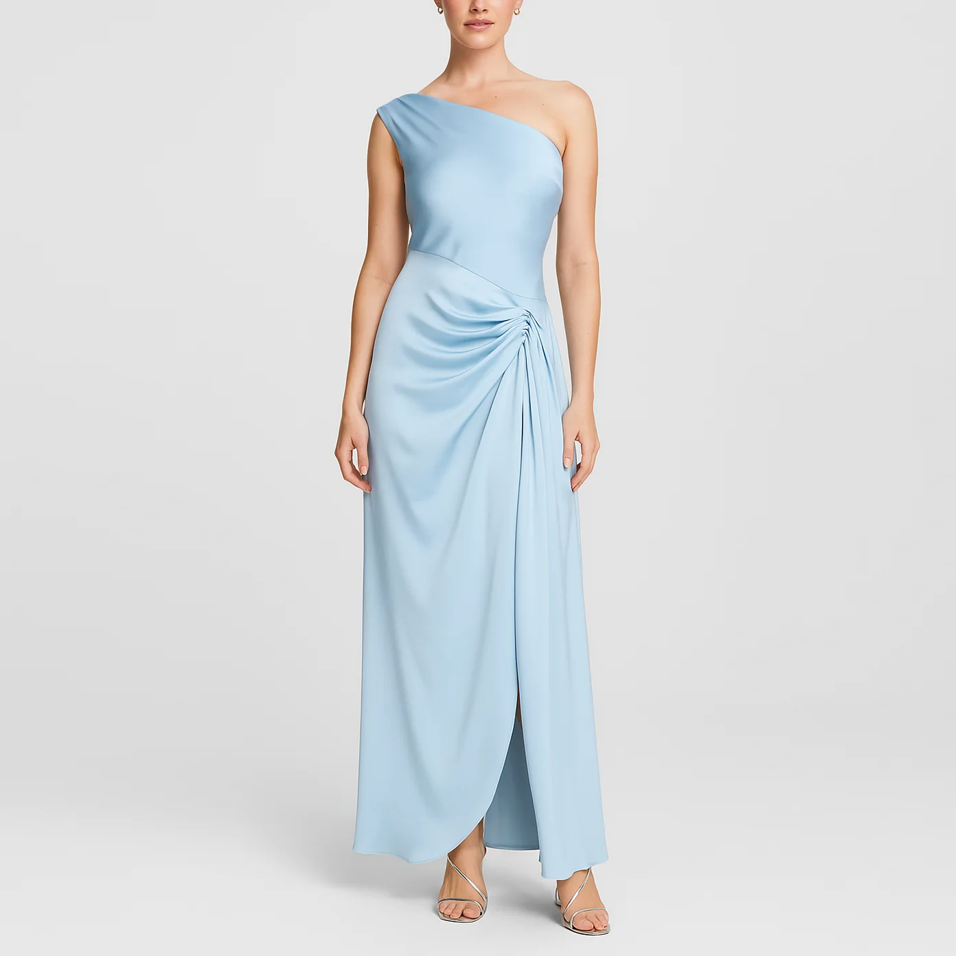 Custom Wholesale Elegant Ladies One Shoulder Women Slit Ruched Satin Maxi Evening Dress