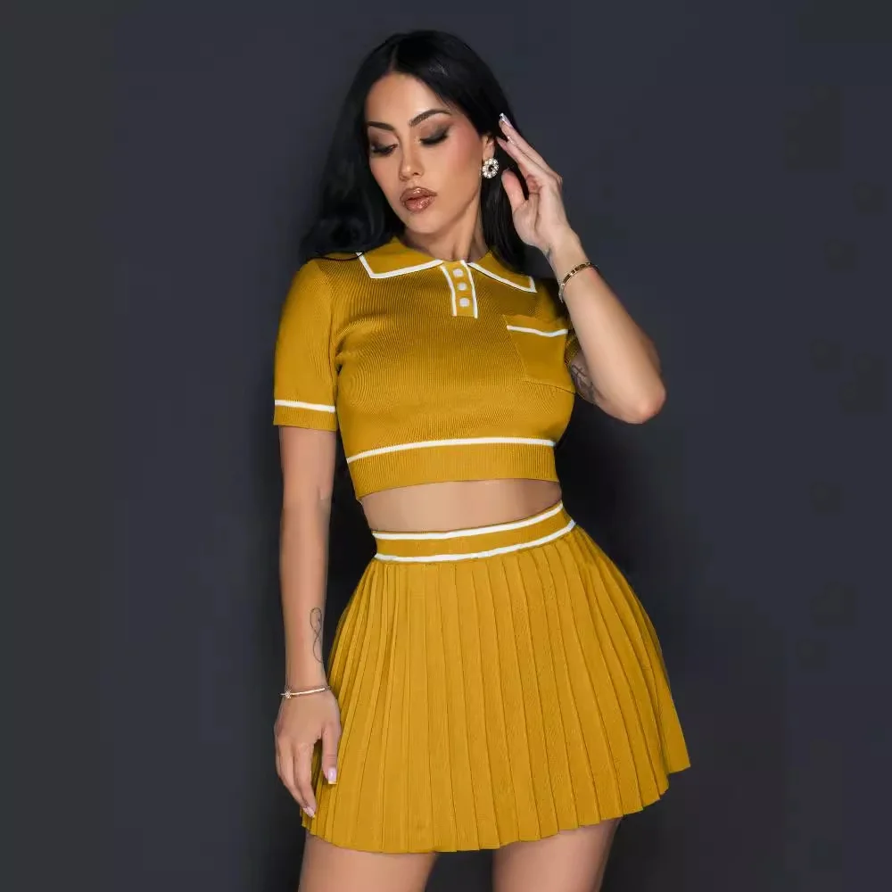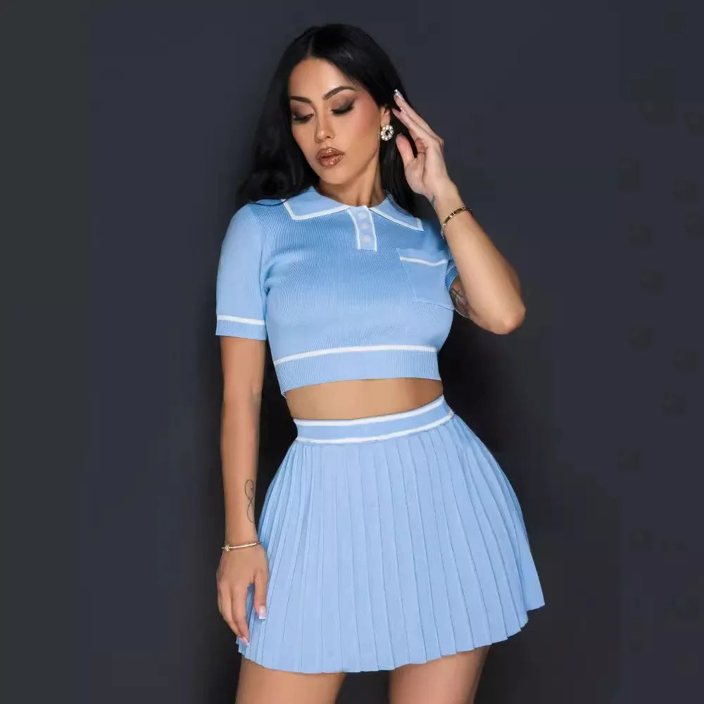 AJ4461 Summer Sweet Striped Crew Neck Short Sleeve Pleated Two-Piece Set Women Knitted Printed Regular Fit Above Knee