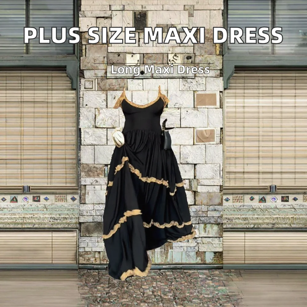 NEW Plus Size Women Eco-Friendly Washable Natural Waist Translucent Solid Print Ruffle Trim Summer Maxi Dress Floor Length