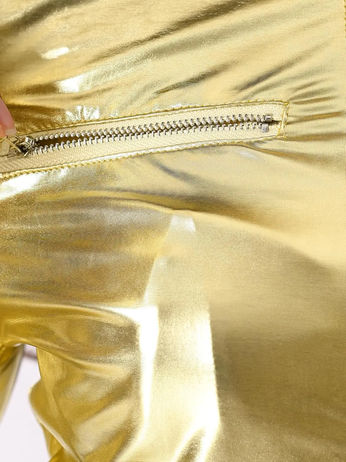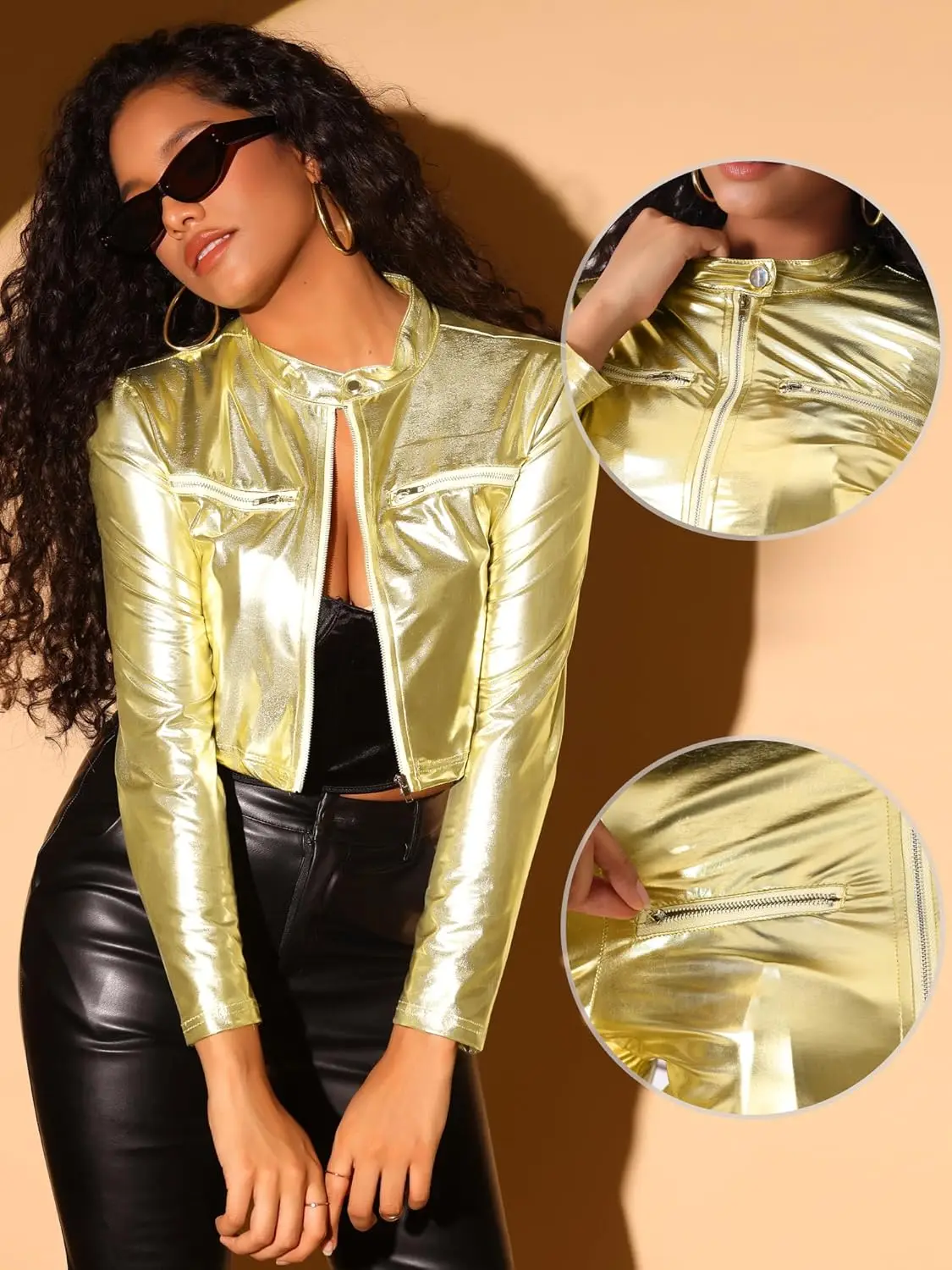 Allegra K Winter Cropped Jacket Women Christmas Costumes Metallic Stand Collar Button Zipper Waterproof Party Club Disco Long