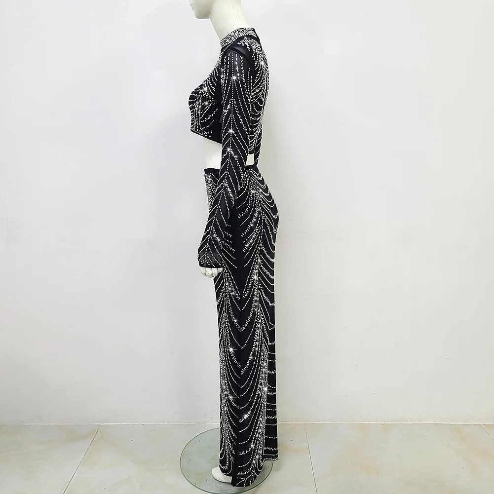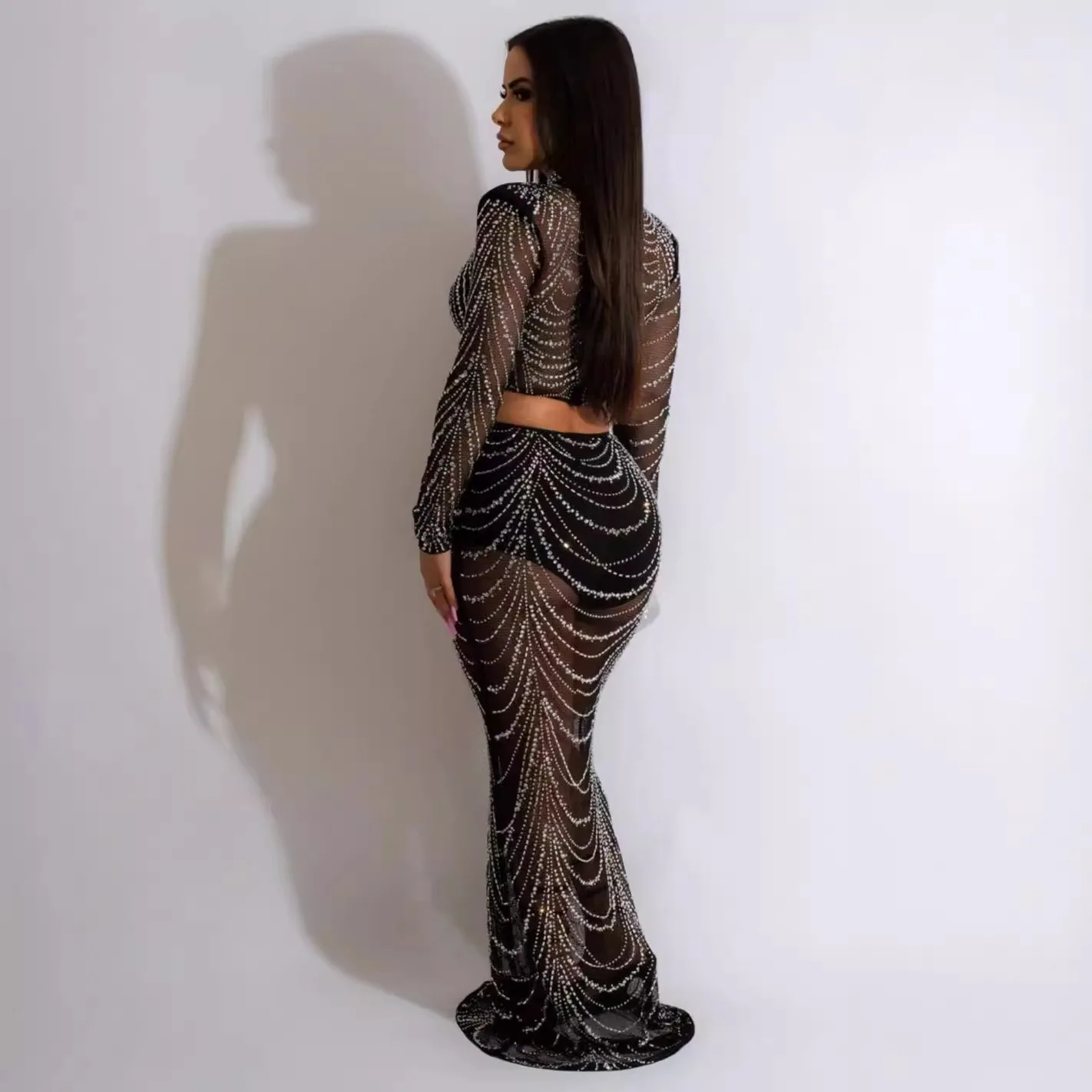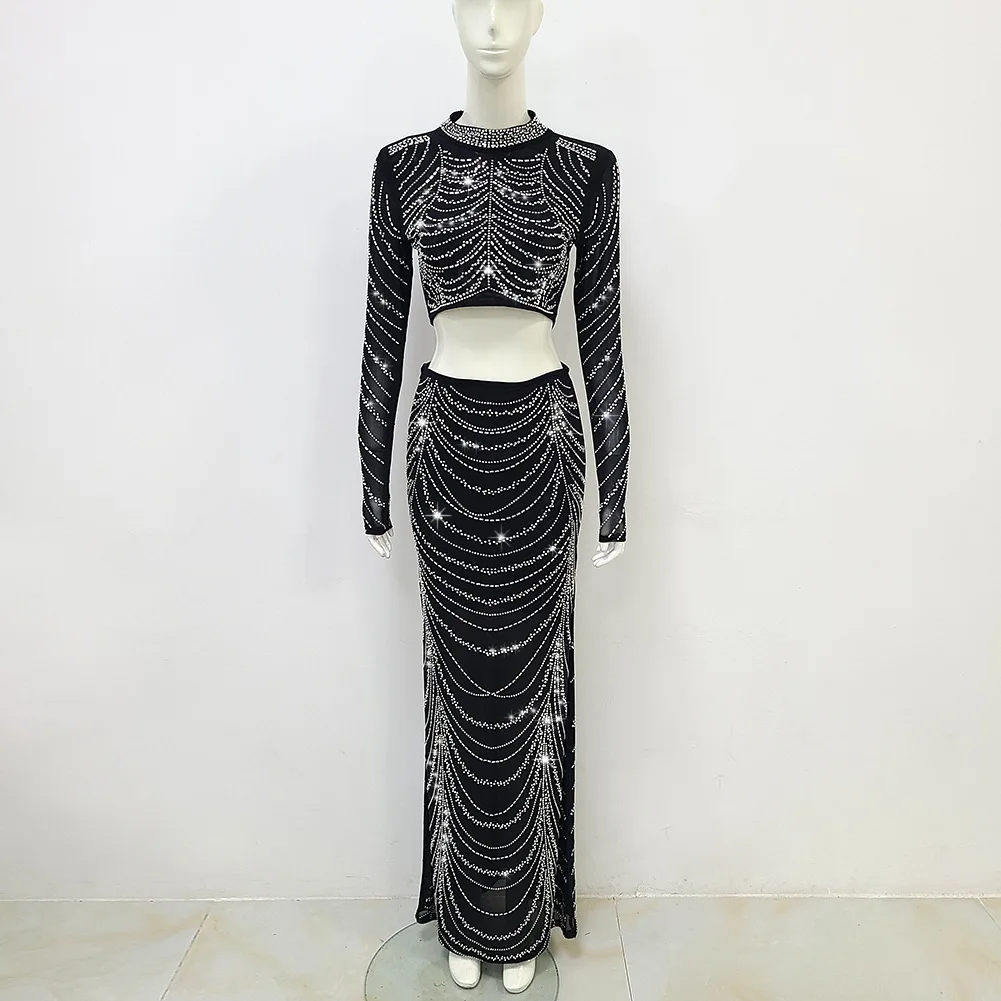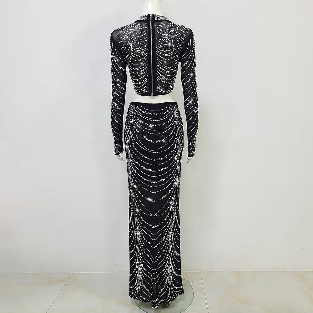European American Luxury A-Line Half Dress Rhinestone Embellished Chiffon Top Natural Cross-Border Banquet Party Suit for Autumn