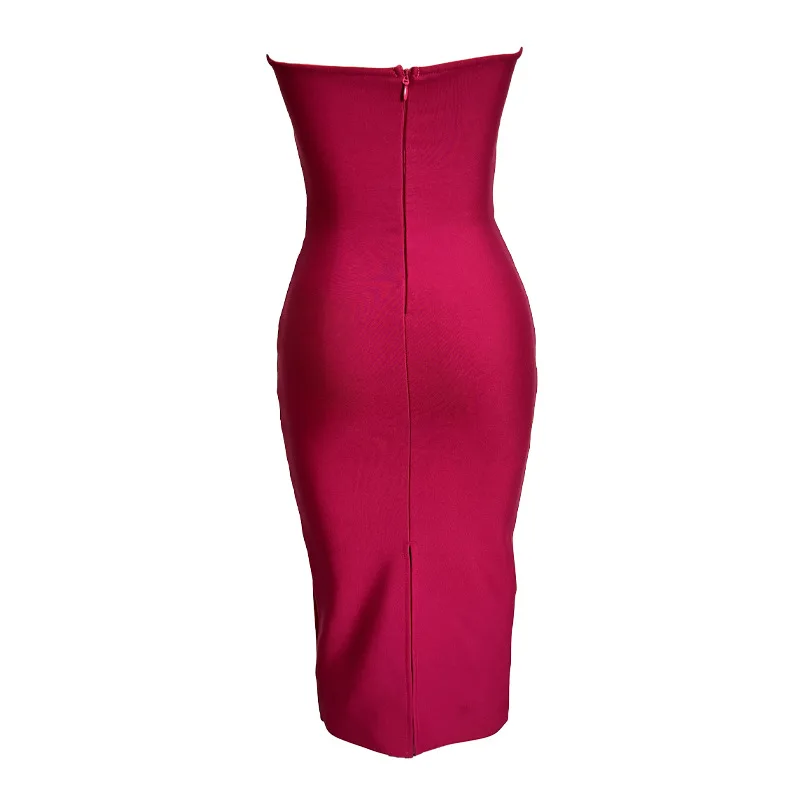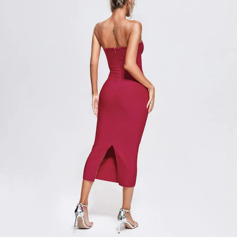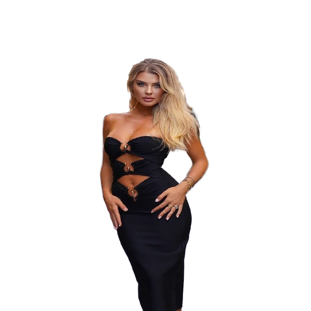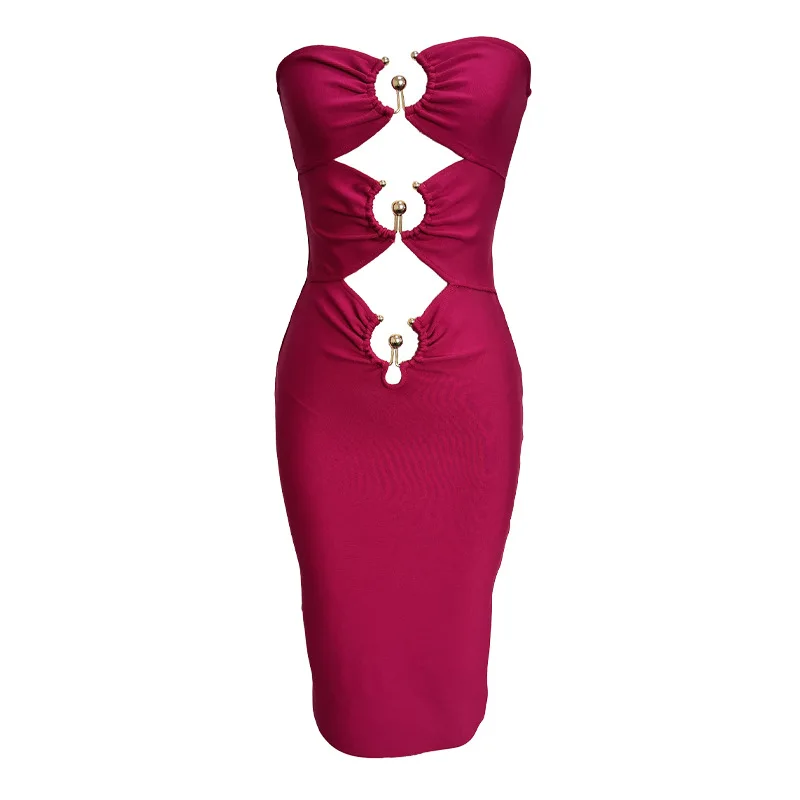 Bandage A-Line Dress for Women Sexy Strapless Design with Metal Ring Stitching Hollow and Breathable Tea-Length Club Dress