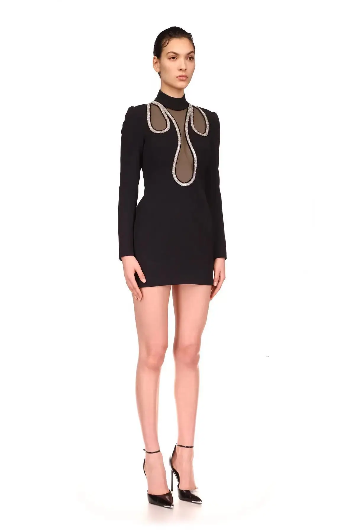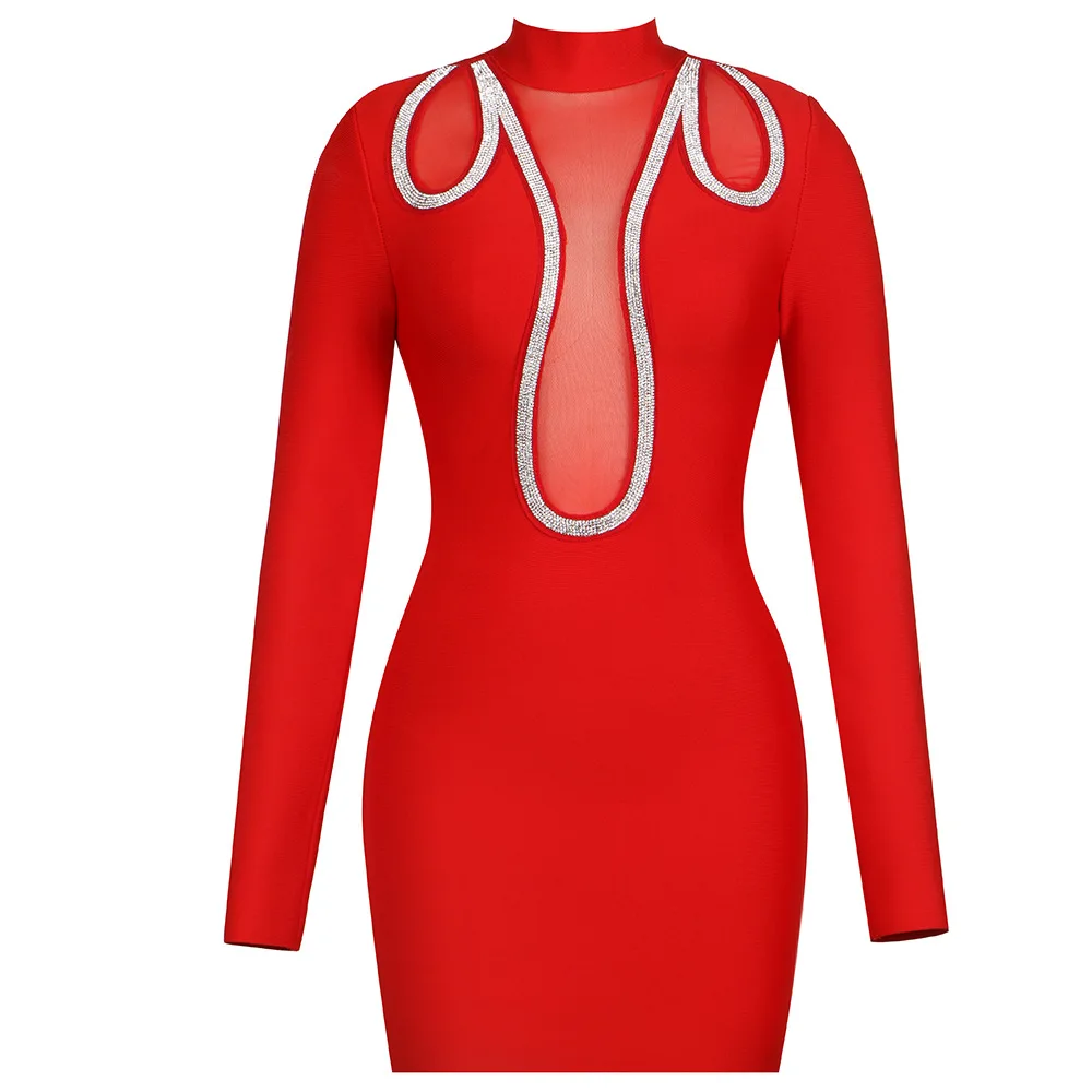 European American Women's Long Sleeve for Bandage Dress Sexy Hollow Solid Mesh Rhinestone Tight-fitting Breathable for Socialite