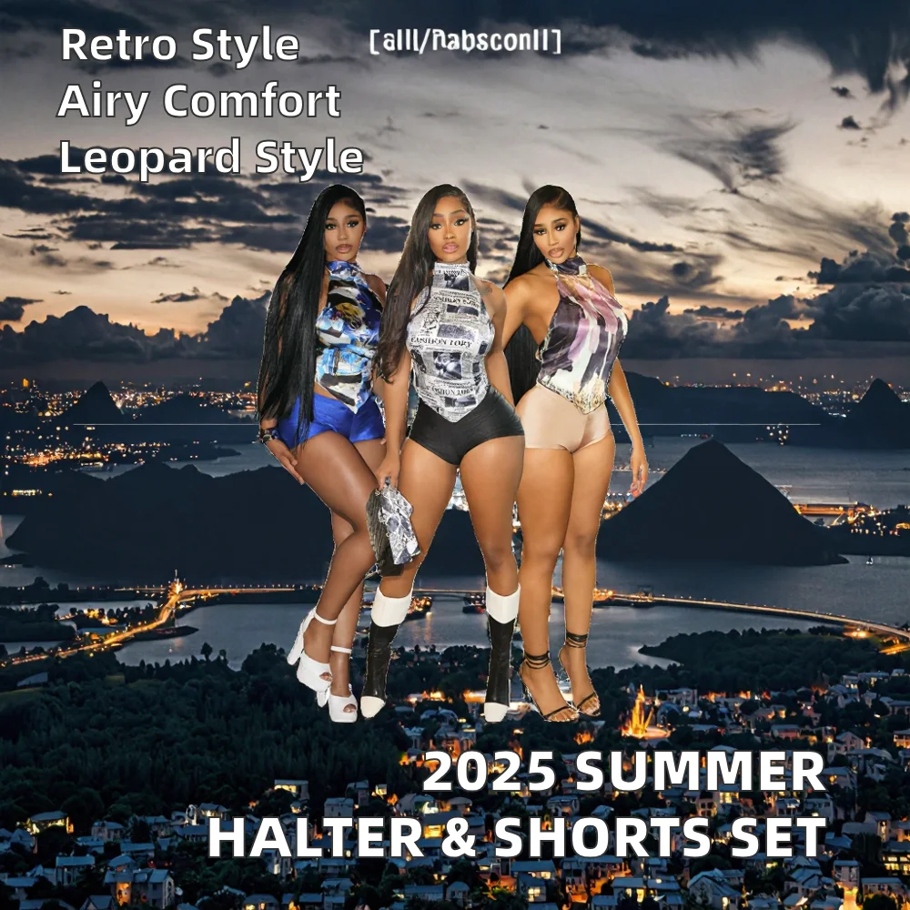 2026 Summer Hot Sale Women's 2-Piece Set Knee Crepe Strapless Shorts Embroidered Vintage Decor Leopard Pattern Halter Print