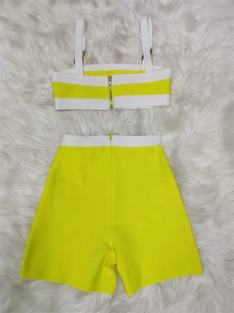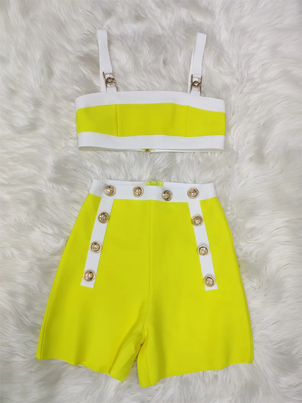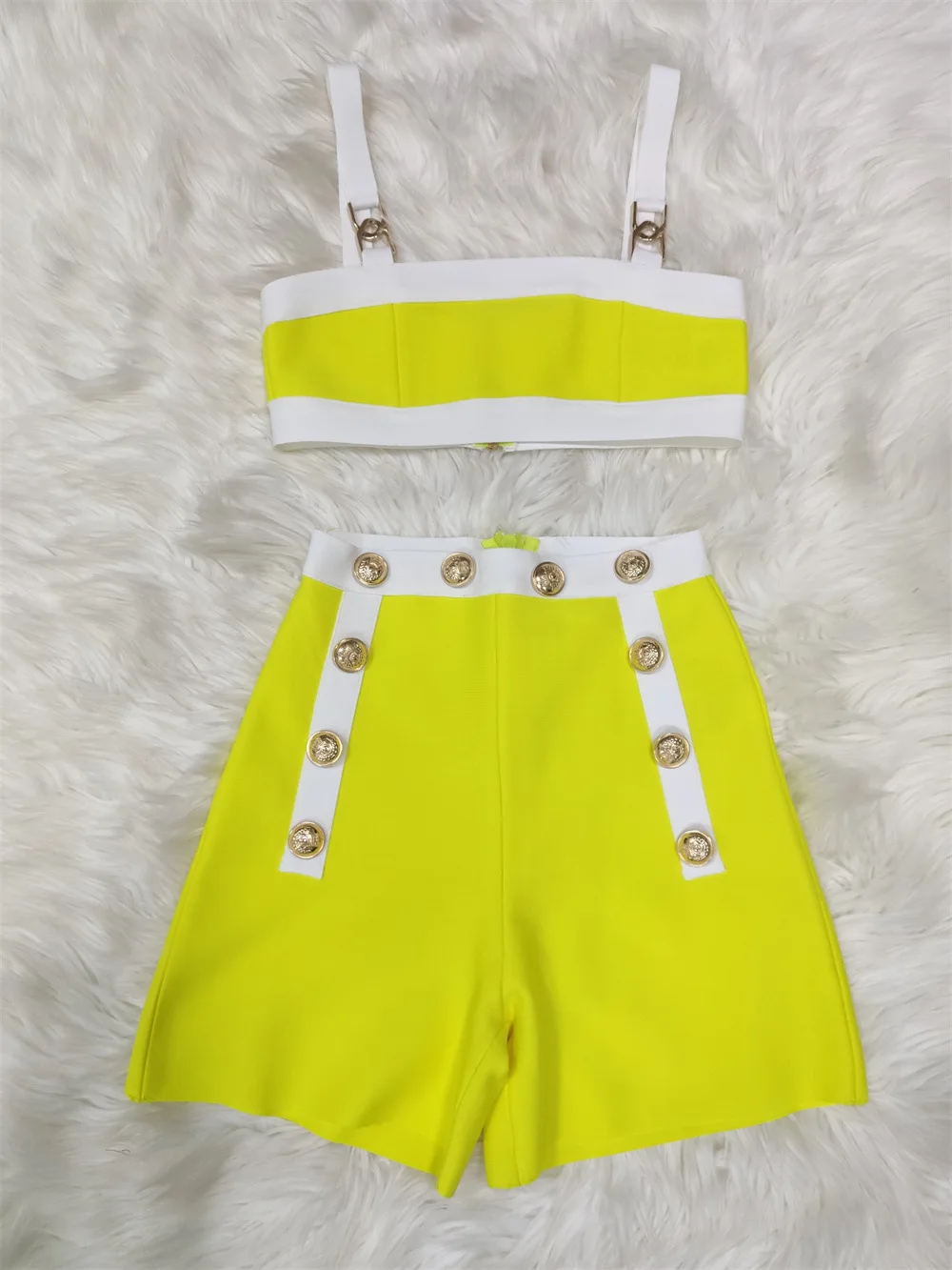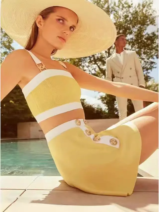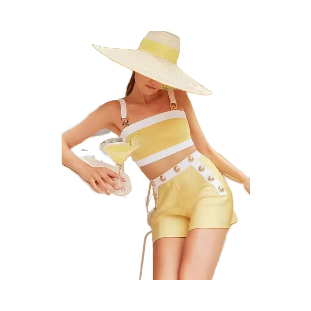 European American Women's Retro Bandage Dress Suit with Bright Yellow Top Shorts & Gold Lion Button Small Straw Hats In-Stock