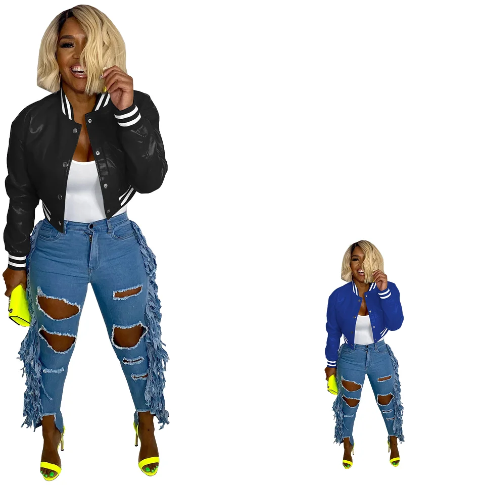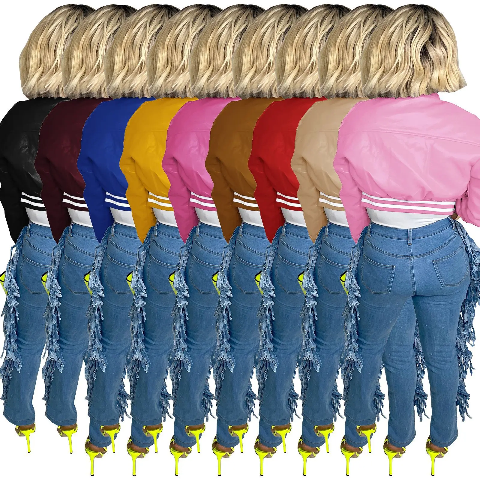 European American Women's HR8237 Baseball Jacket New Autumn Winter Stretch Leather Casual Solid Pattern Stand Short Length