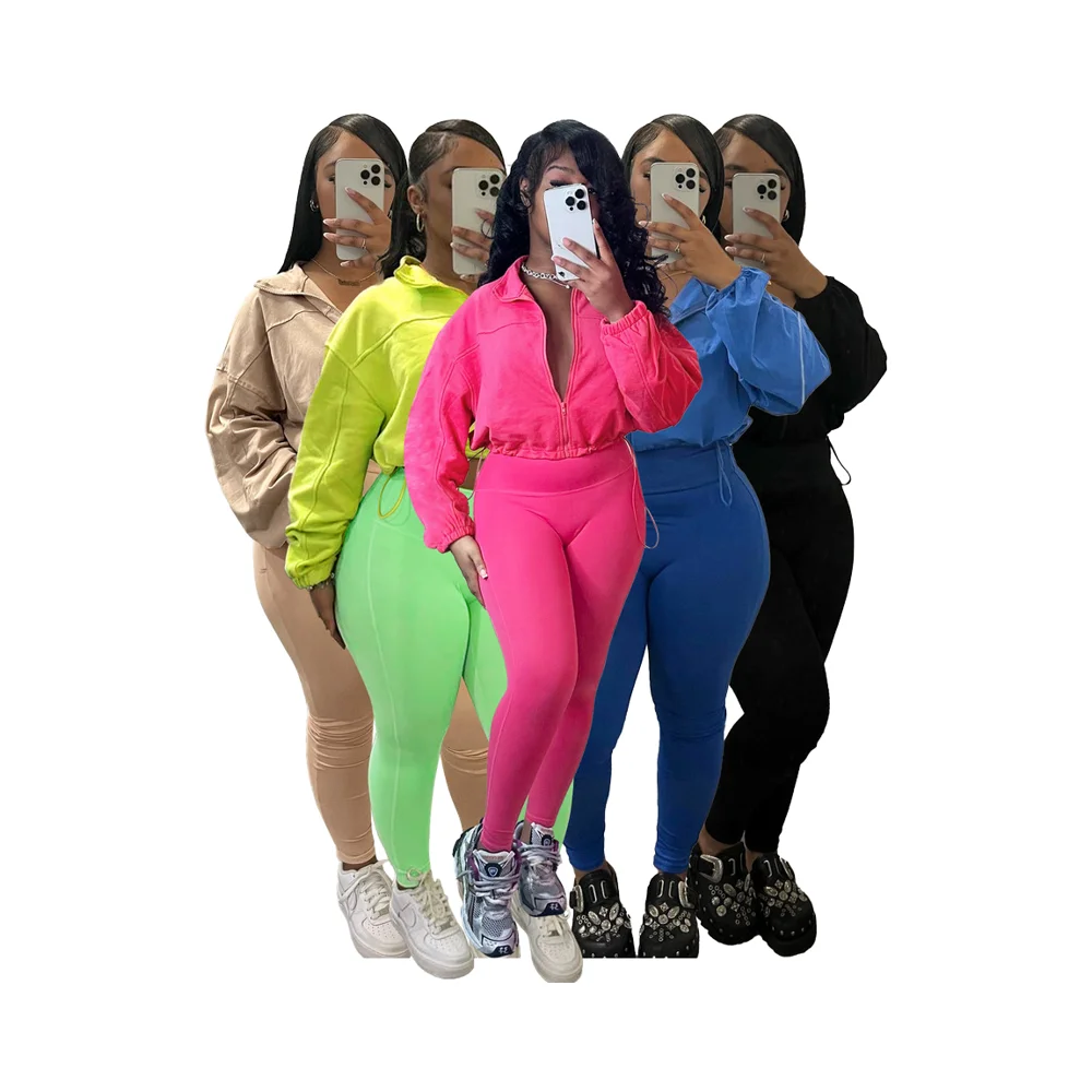 European American Style Women's Casual Two-Piece Zipper Waist Shoulder Sleeve Suit Solid Pattern Canvas Fabric for Autumn