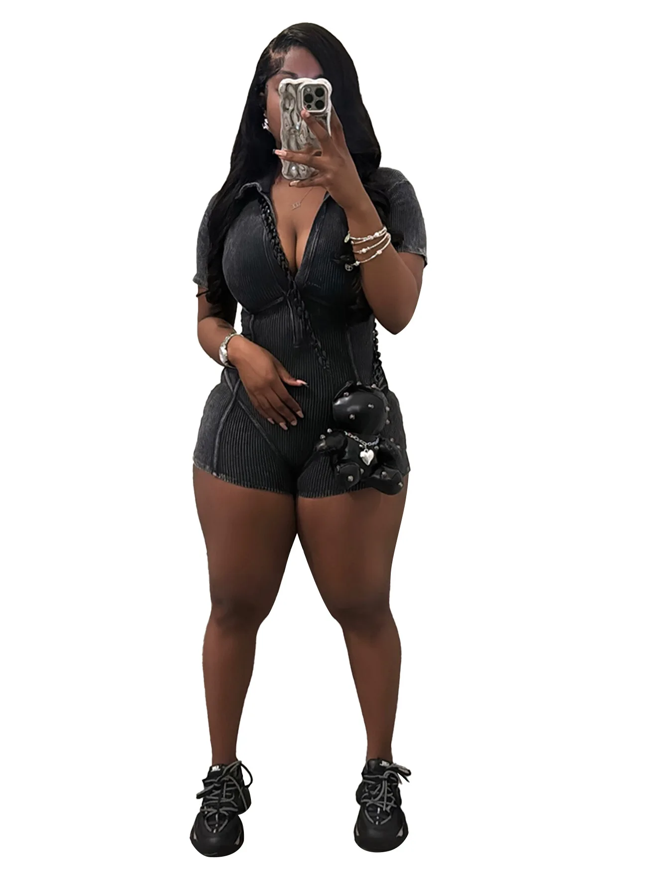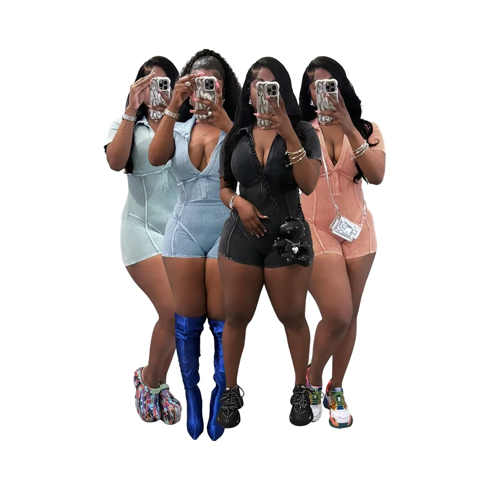 European American Women's HR24026 Cotton Thread Washed Old Deep V Lapel Jumpsuit International Station's Hot Selling Playsuit