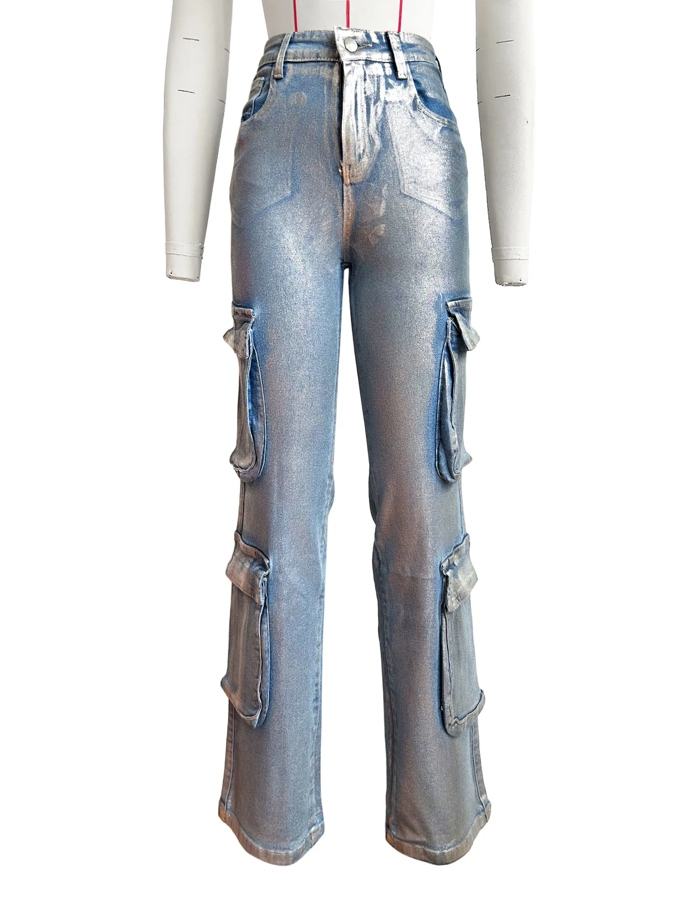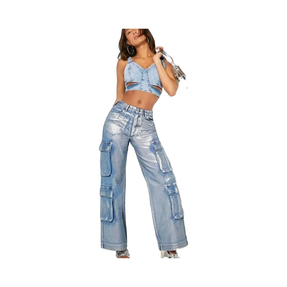 European American Women's High Loose Straight Cut Denim Overalls Breathable Casual Fashionable Silver Ironing Process Front