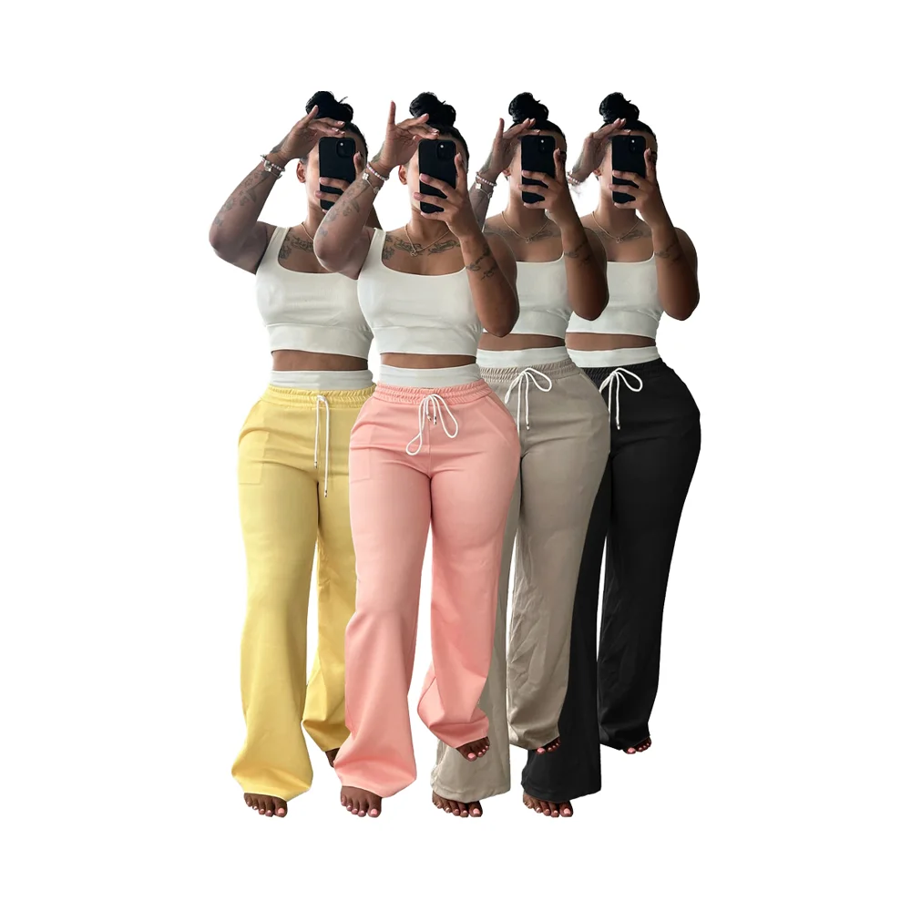 European American Women's Summer 2-Piece Shorts Set New High Waist Wide Leg Pants Suit Double Waist Design Solid Color Casual