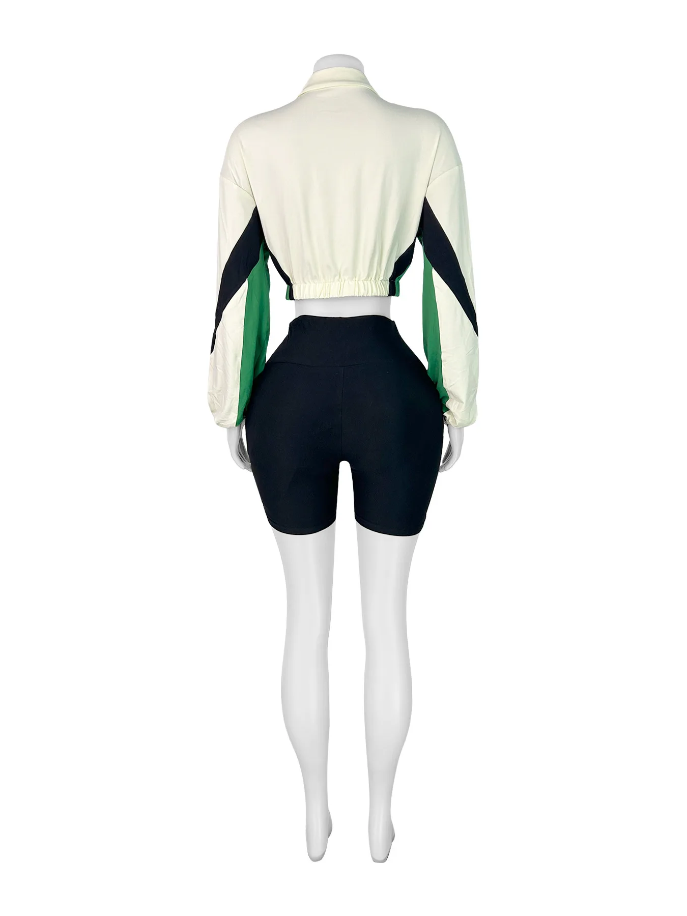 European American Fashion Women's Casual Sports Two-Piece Suit Slim-Fit Long-Sleeved Shorts Contrast Color Stitching for Summer