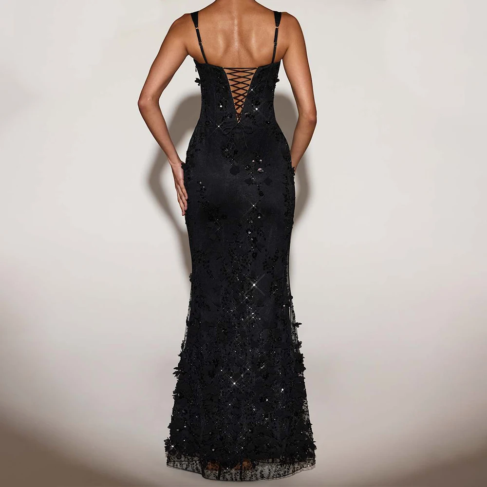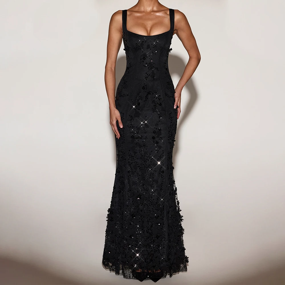 OEM Luxury Heavy Embellished Women's Elegant Adjustable Strap Maxi Dress with 3D Floral Details Wedding Guest Evening Party Prom