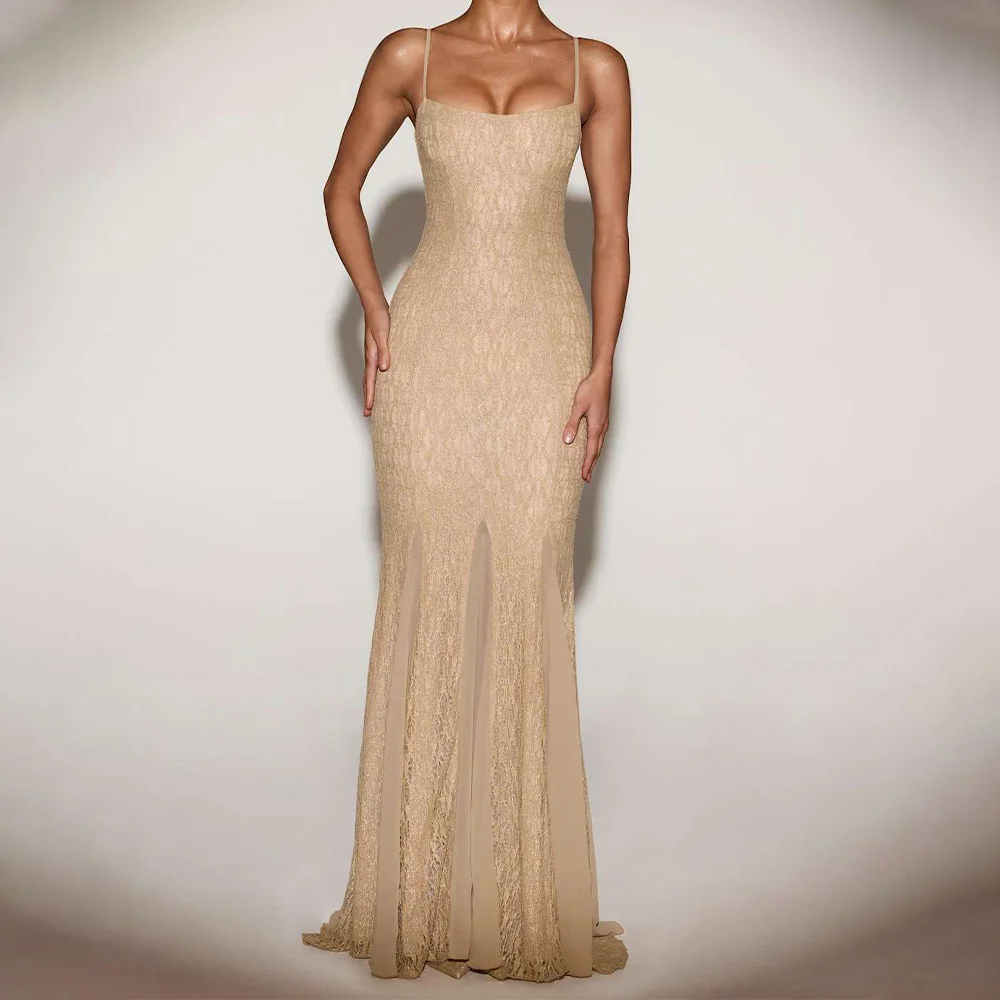 Champagne Spaghetti Strap Lace Mermaid Maxi Dress with Sheer Panel Detail Elegant Formal Gown for Evening Wedding Party