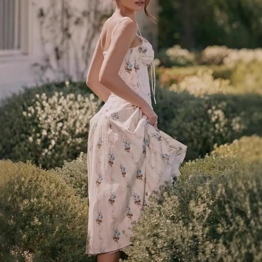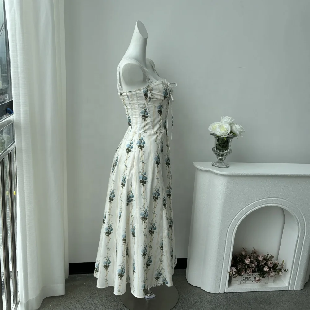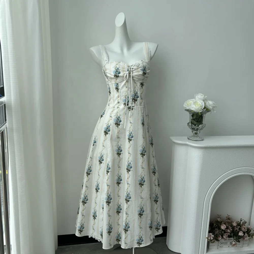 Quality Summer Women's Custom High Waist Front Tie A-line Casual Vacation Dress Lace Trim Hydrangea Print Ladies Midi Dress