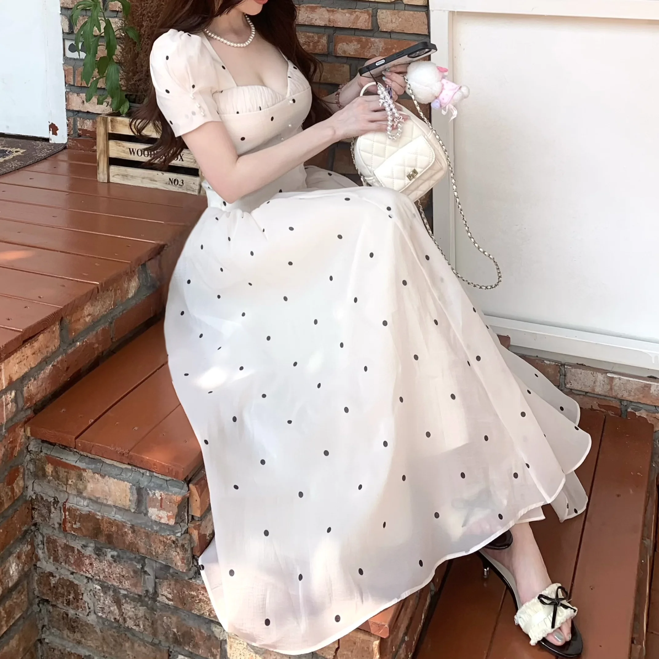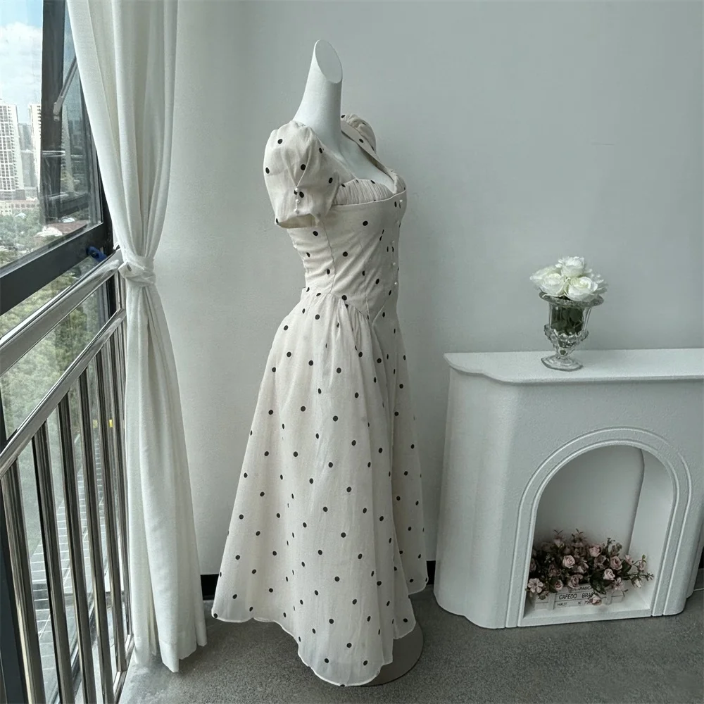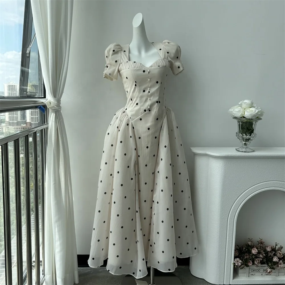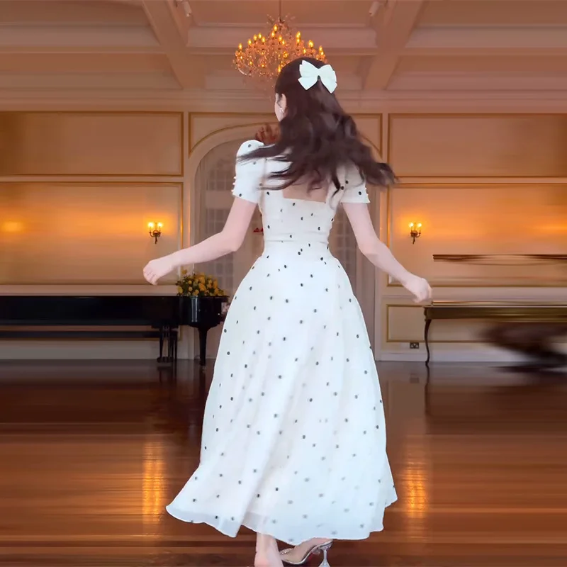 French Style Polka Dot Dress Pearl Detail Puff Sleeves Smocked Waist Backless Full Skirt Elegant Temperament Casual Midi Dress
