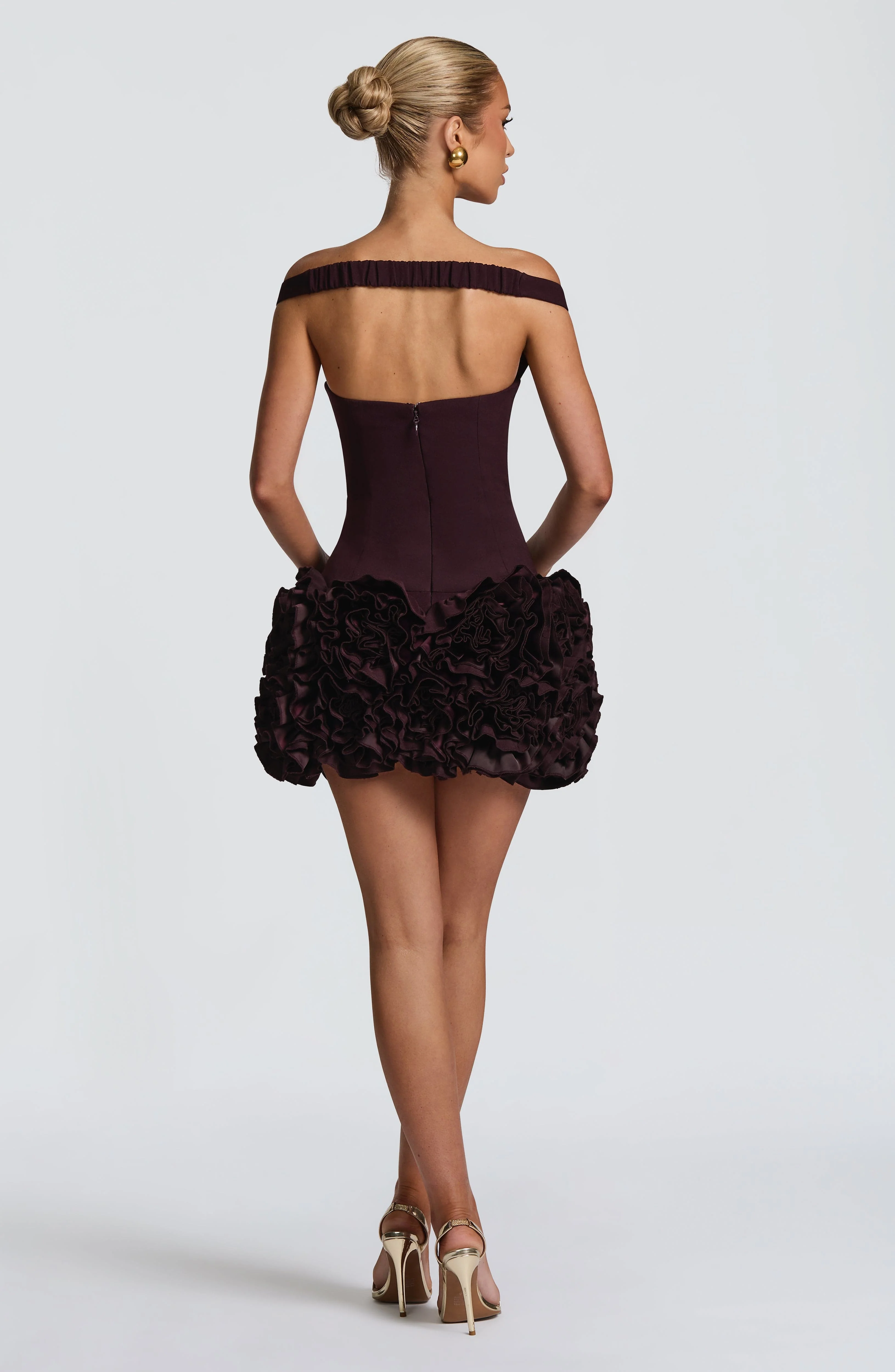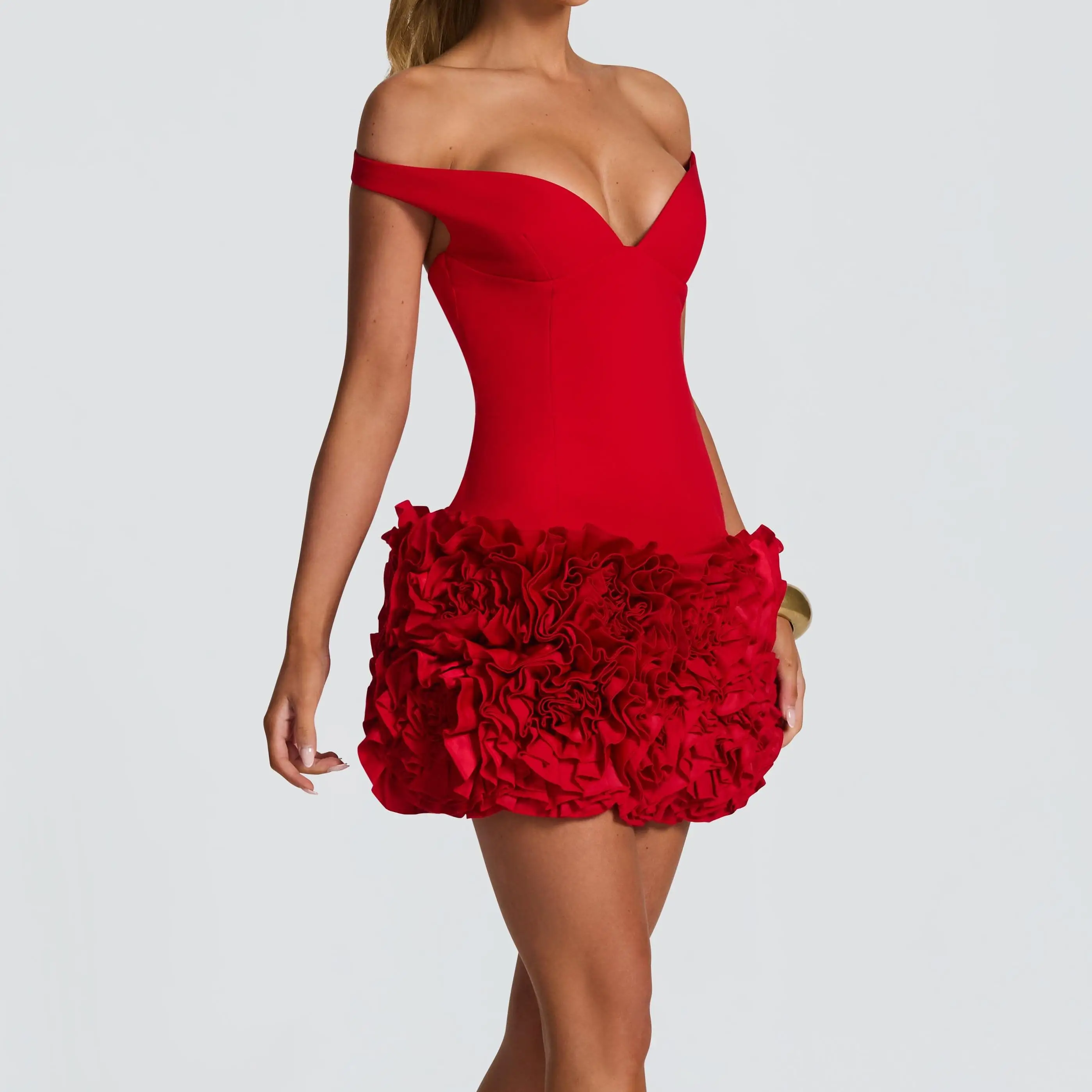 OEM Off Shoulder Bodycon Deep V Front Open Back Structured Waist 3D Floral Embellished Low Back Bodycon Cocktail Gown Mini Dress