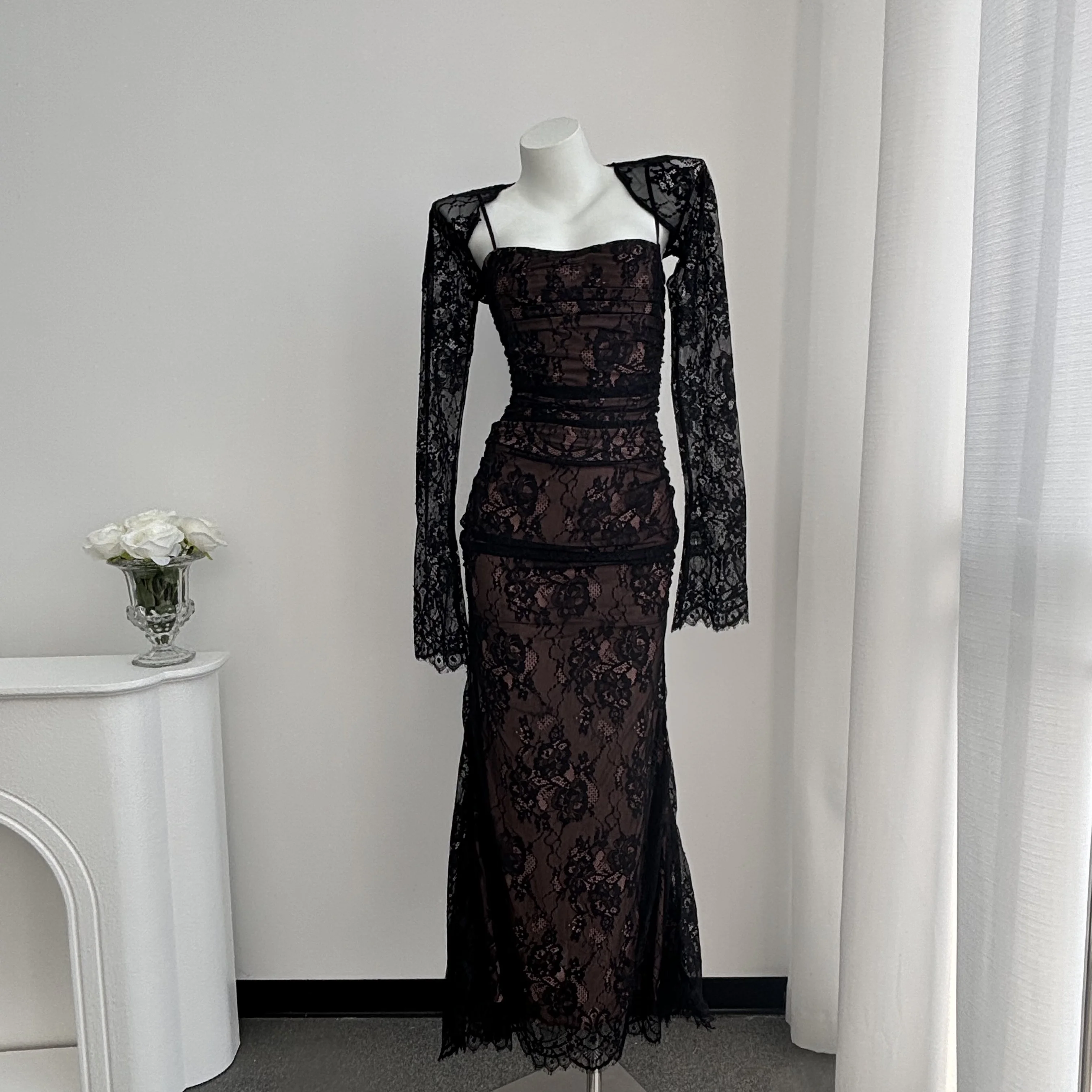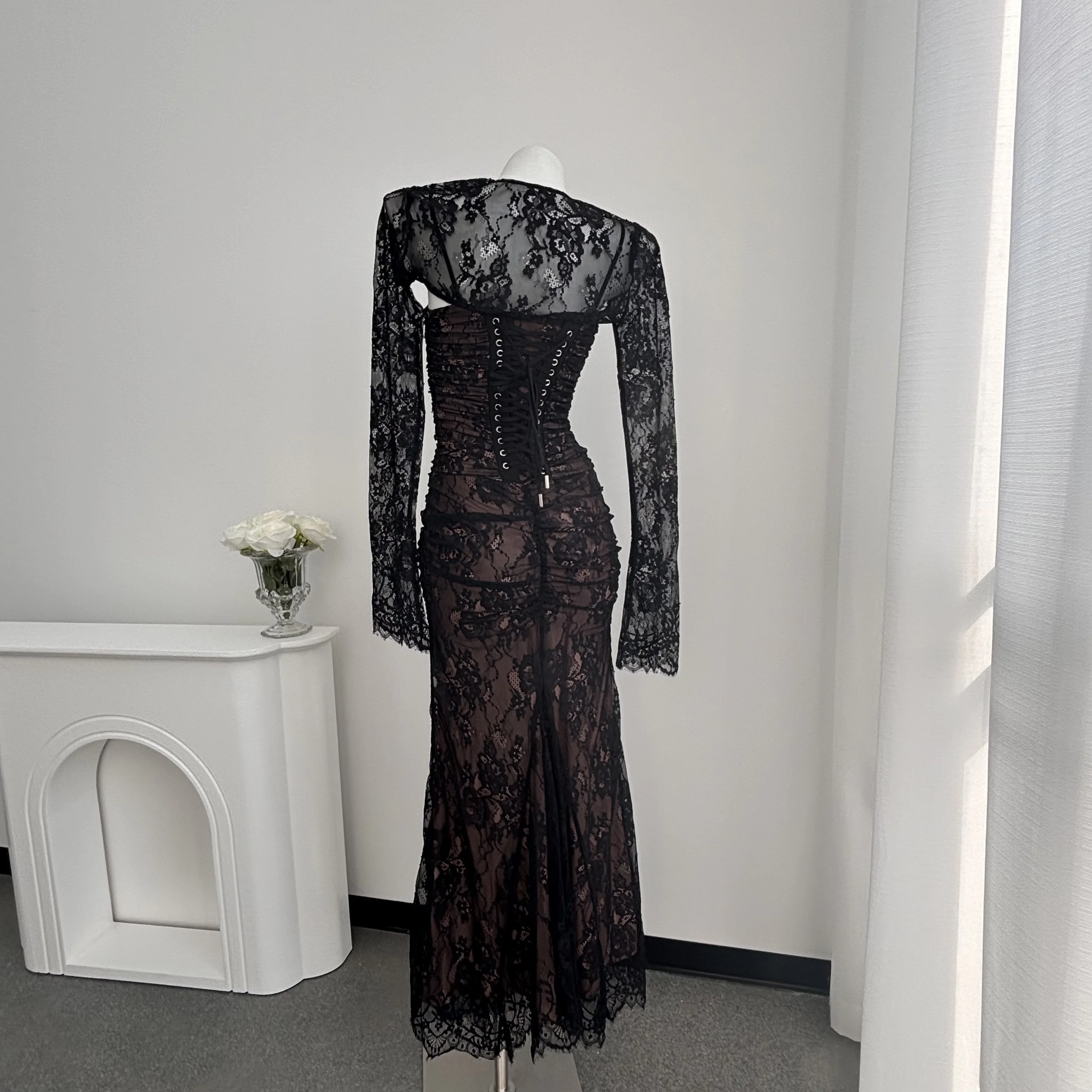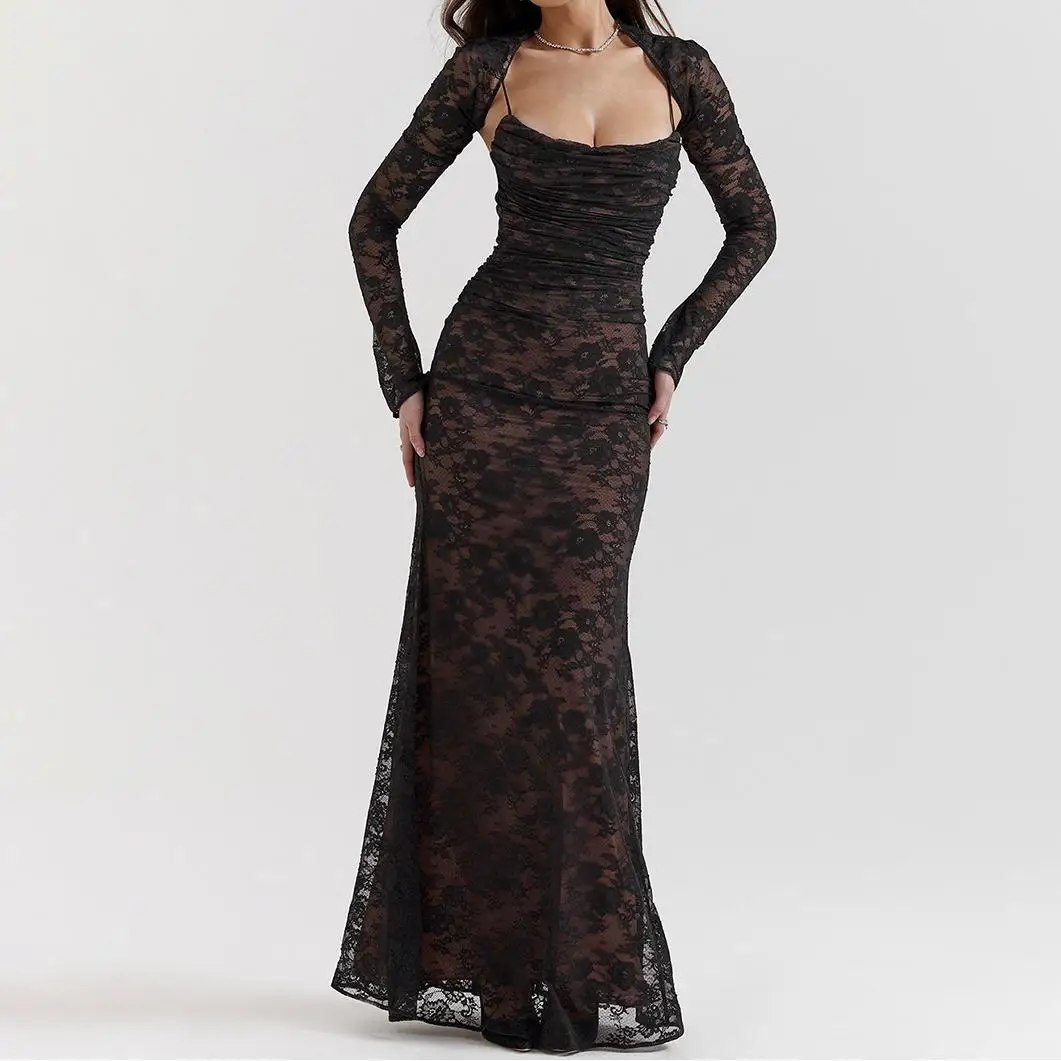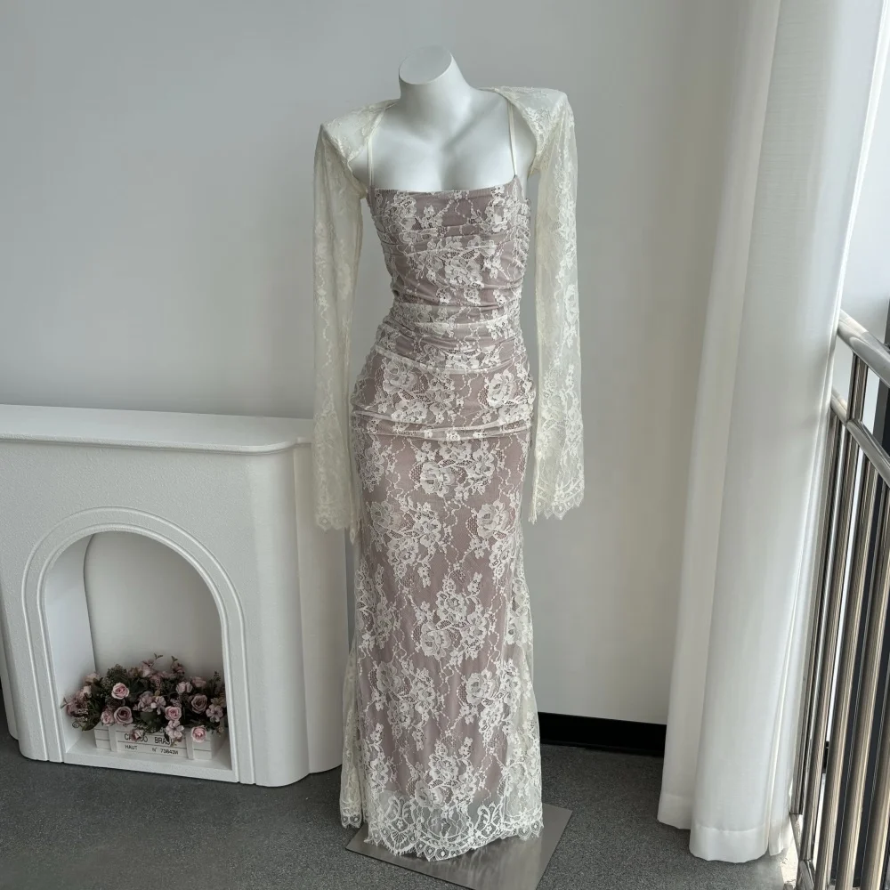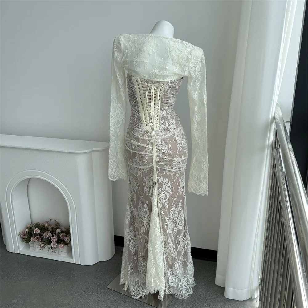 High Quality Lace Printed Women Back Bandage Long Sleeve Two Pieces Chic Maxi Dress High Waisted Slim Evening Party Dresses