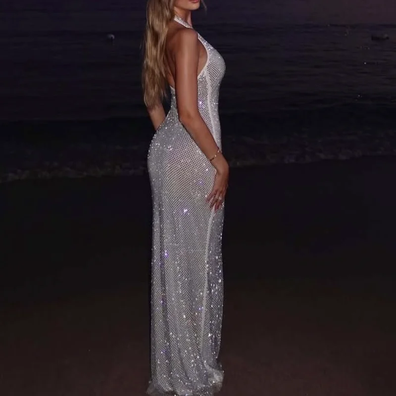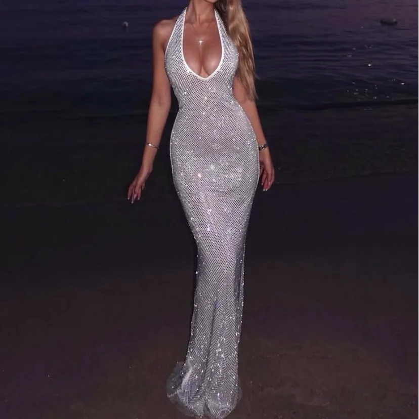 Custom Wholesale Sexy Backless Halter V-neck Bodycon Rhinestone Formal Wear Shiny Club Party Gown Long Mermaid Evening Dress
