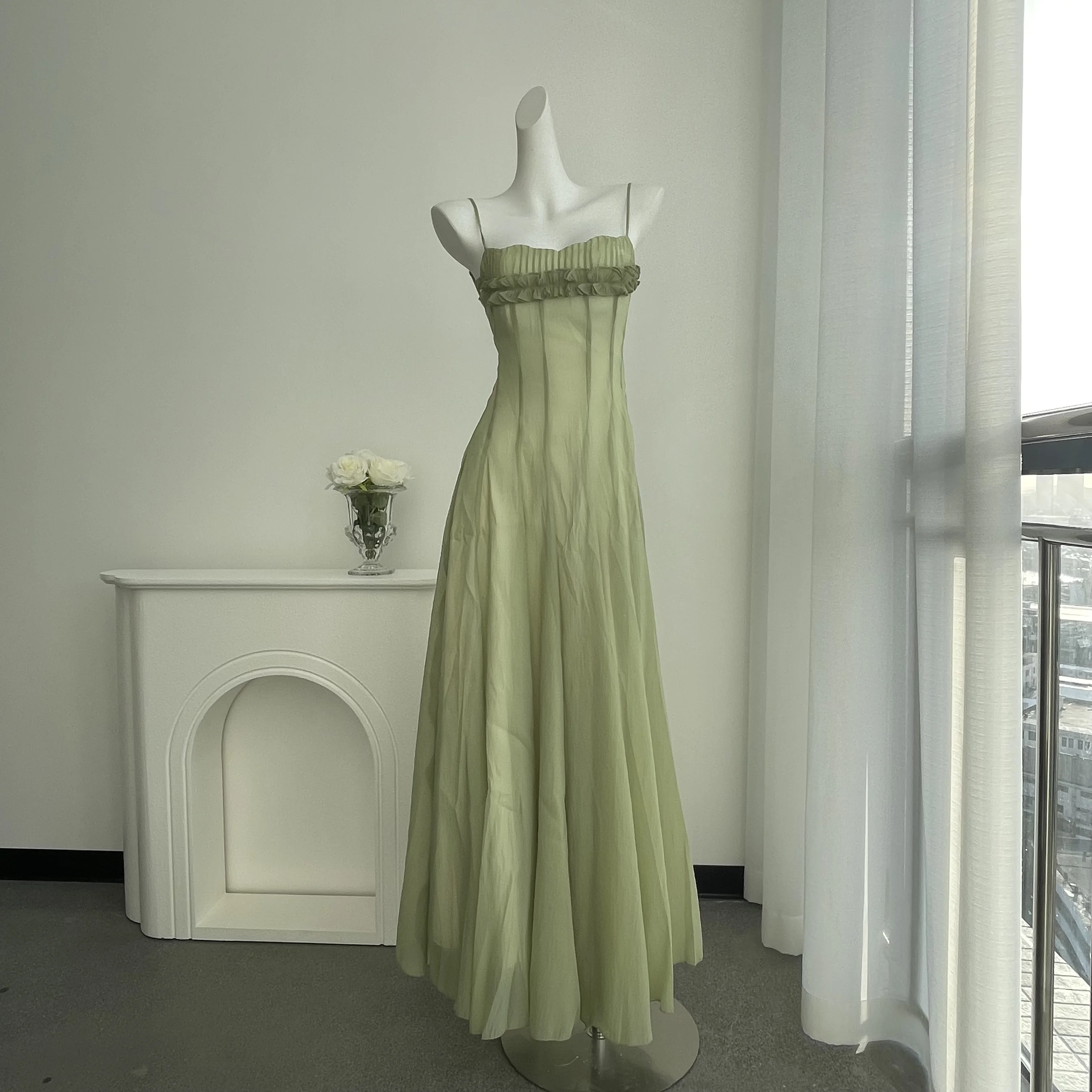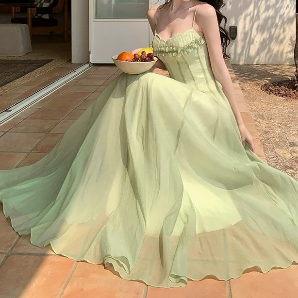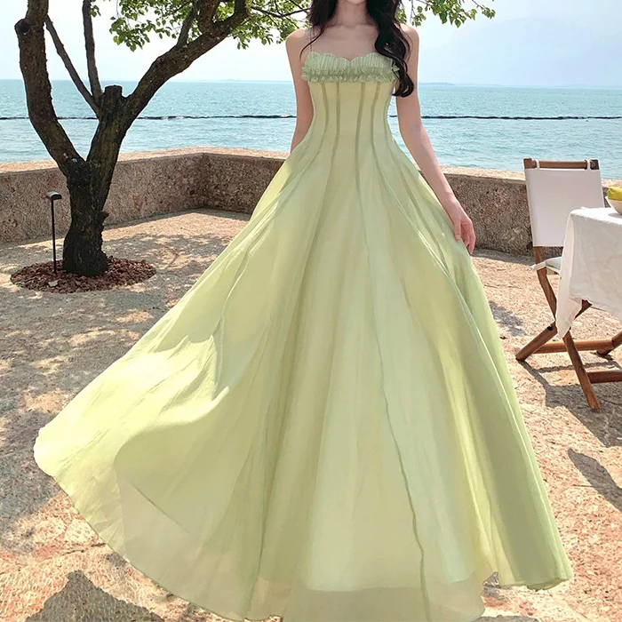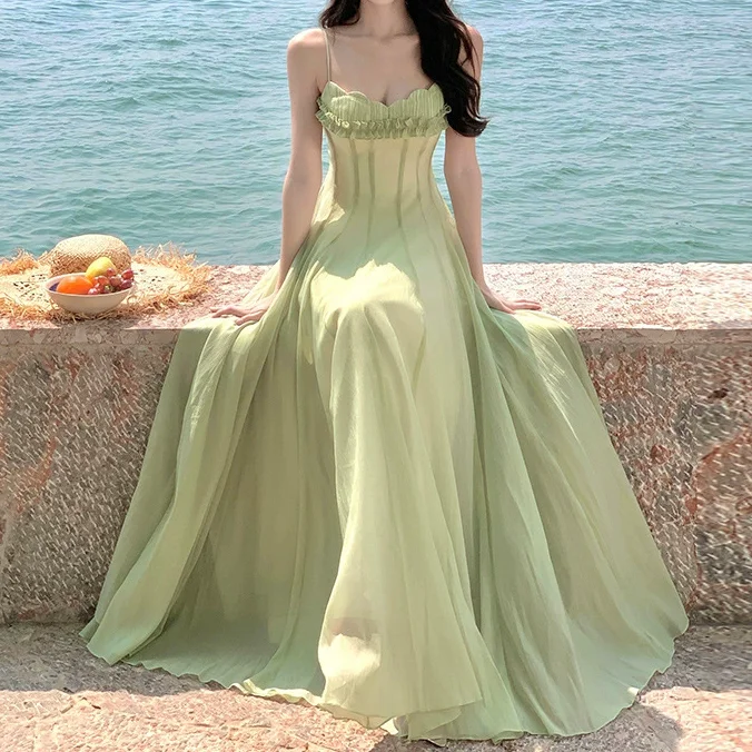 Green Spaghetti Straps Maxi Dress Sleeveless Flowy A-Line Beach Dress for Vacation Summer Party Photoshoot Sundress